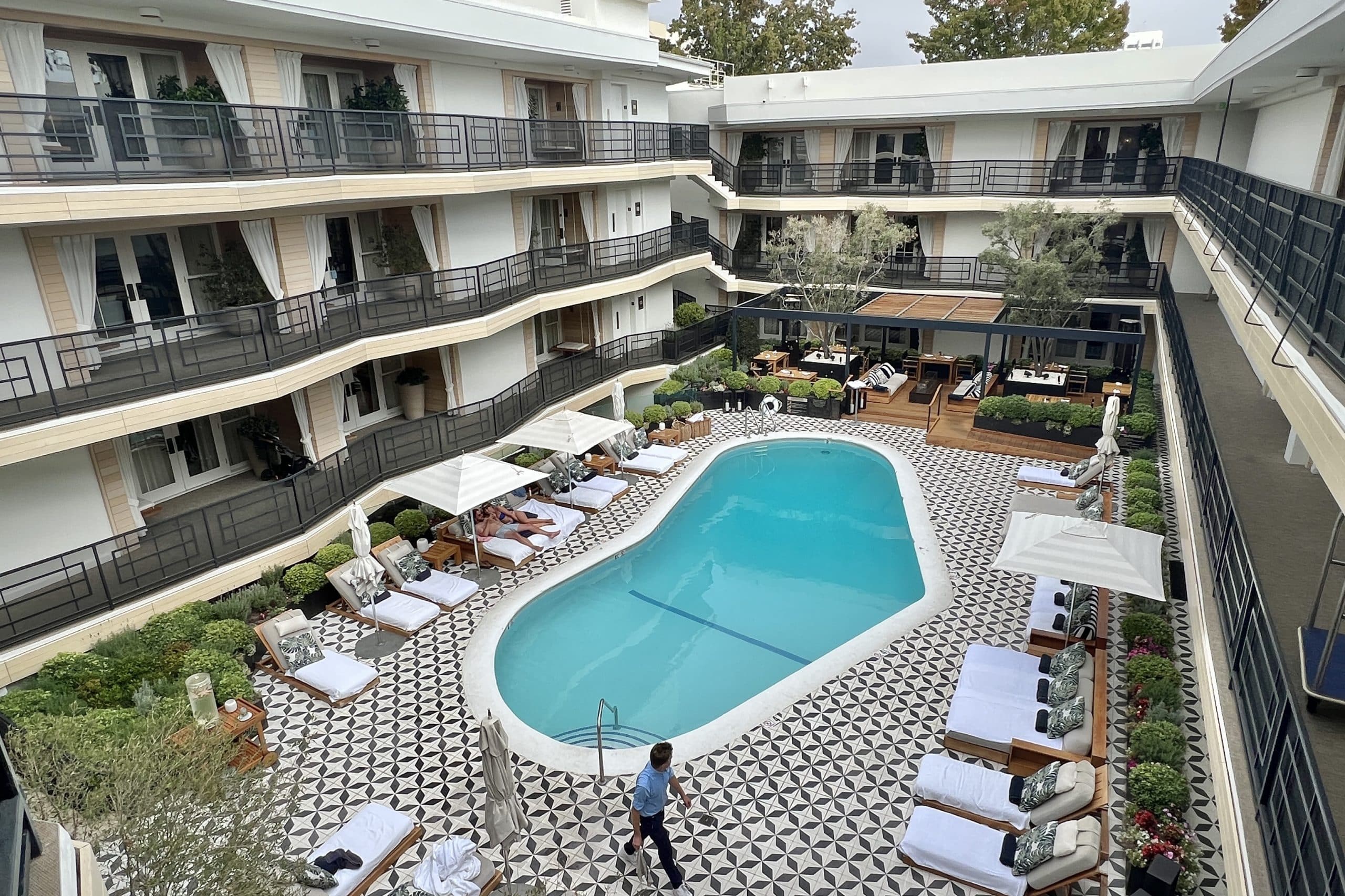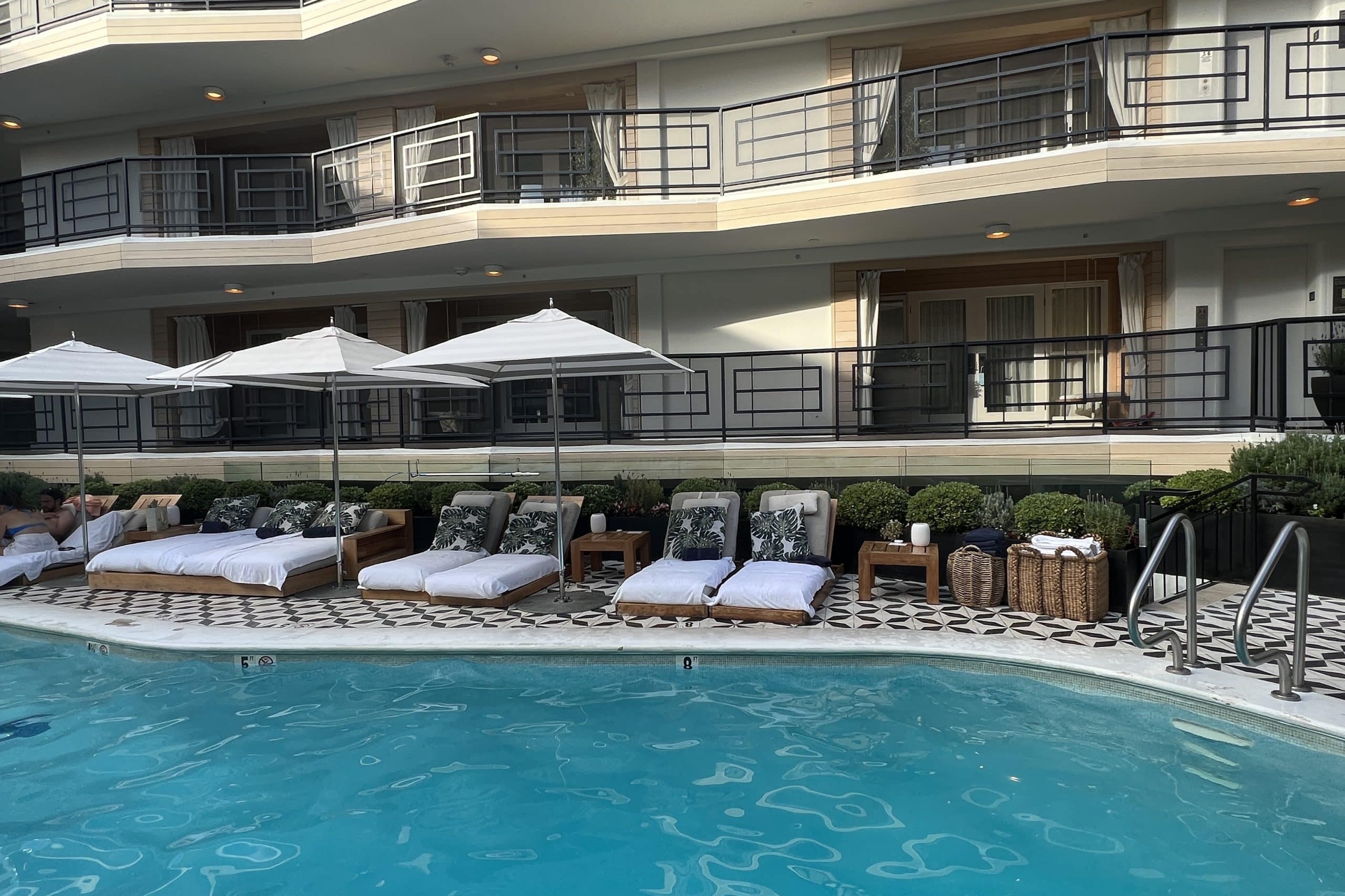 The Oceana Santa Monica has a cute heart-shaped pool in the centre courtyard of the hotel. There are loungers, sofas, and daybeds with comfortable cushioning around the pool.