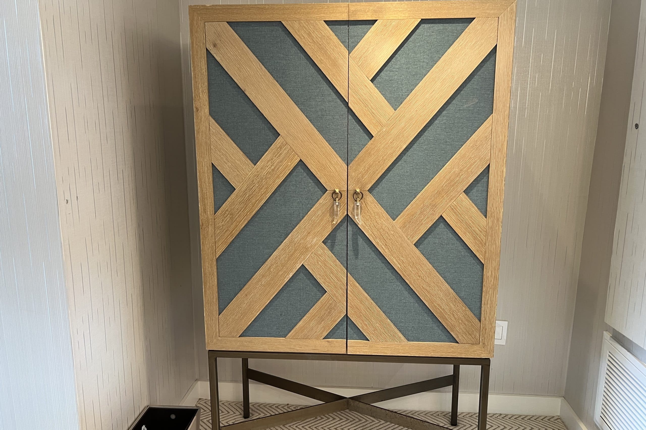 The floors were carpeted, and the walls were decorated in a textured light grey wallpaper, in contrast to the darker coffered ceiling atop. When you look at the furniture pieces, they are all very different in style and in colour, but somehow, it all blended well together.