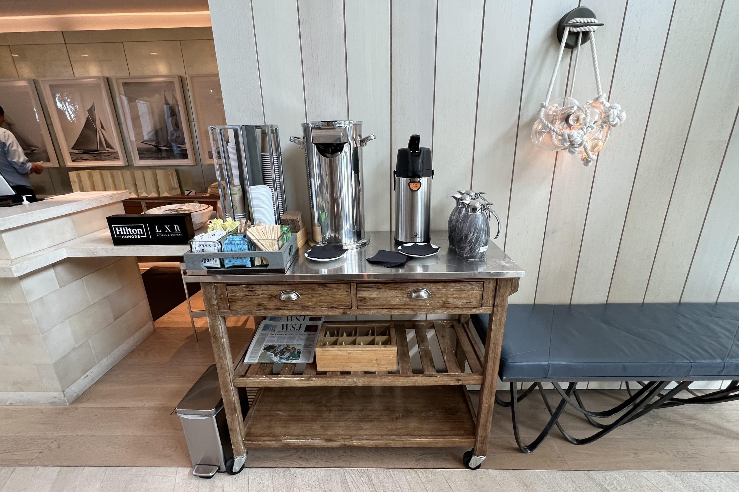 Interestingly, there is no tea and coffee station in the room. Rather, there is complimentary tea and coffee in the lobby for all guests to use.