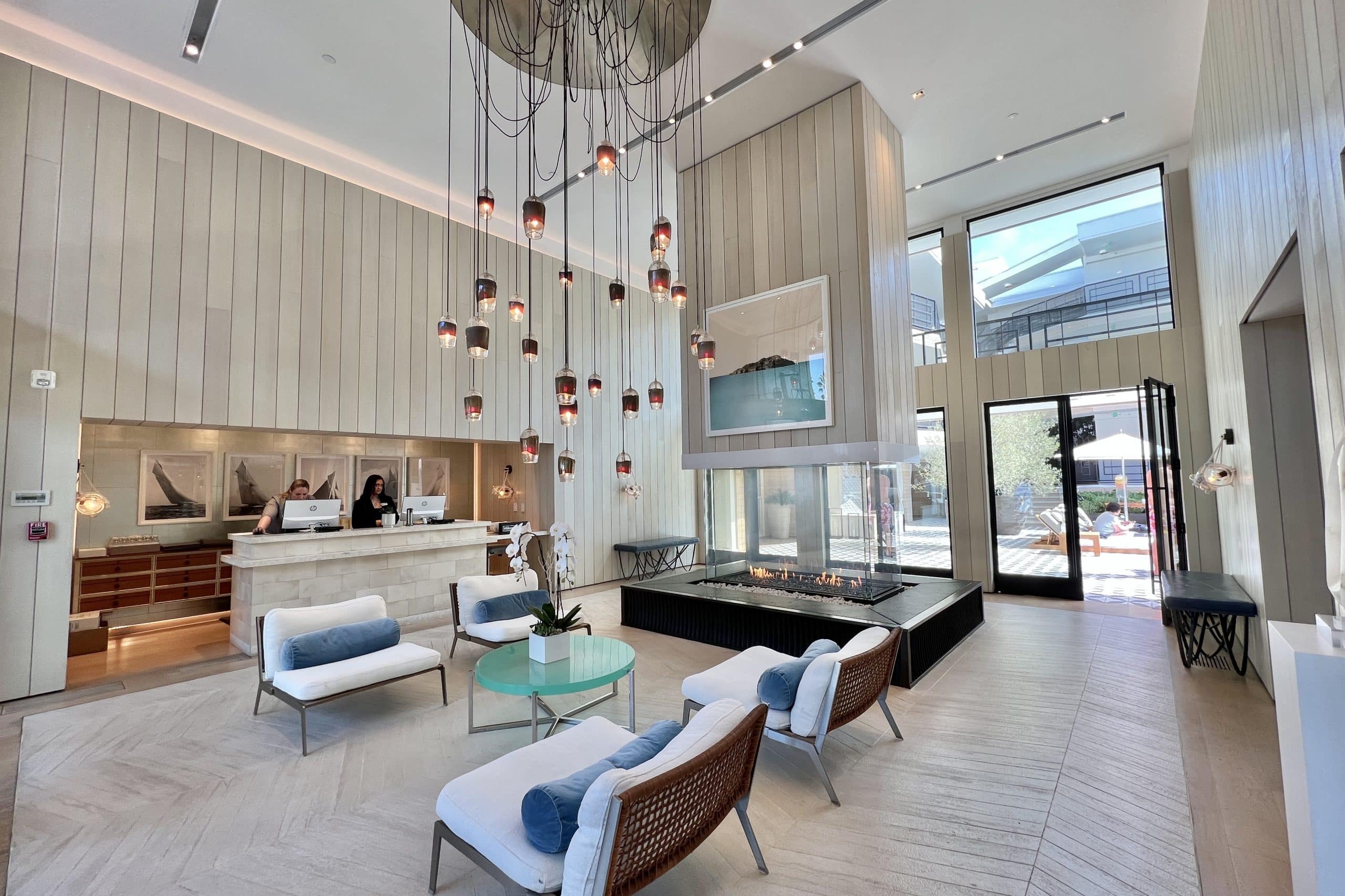 Upon entering the brightly-lit lobby with a cathedral ceiling, you get an immediate sense of warm yet chic luxury. There are a few seats arranged around a coffee table, and a fireplace behind it, as if walking into someone’s living room.