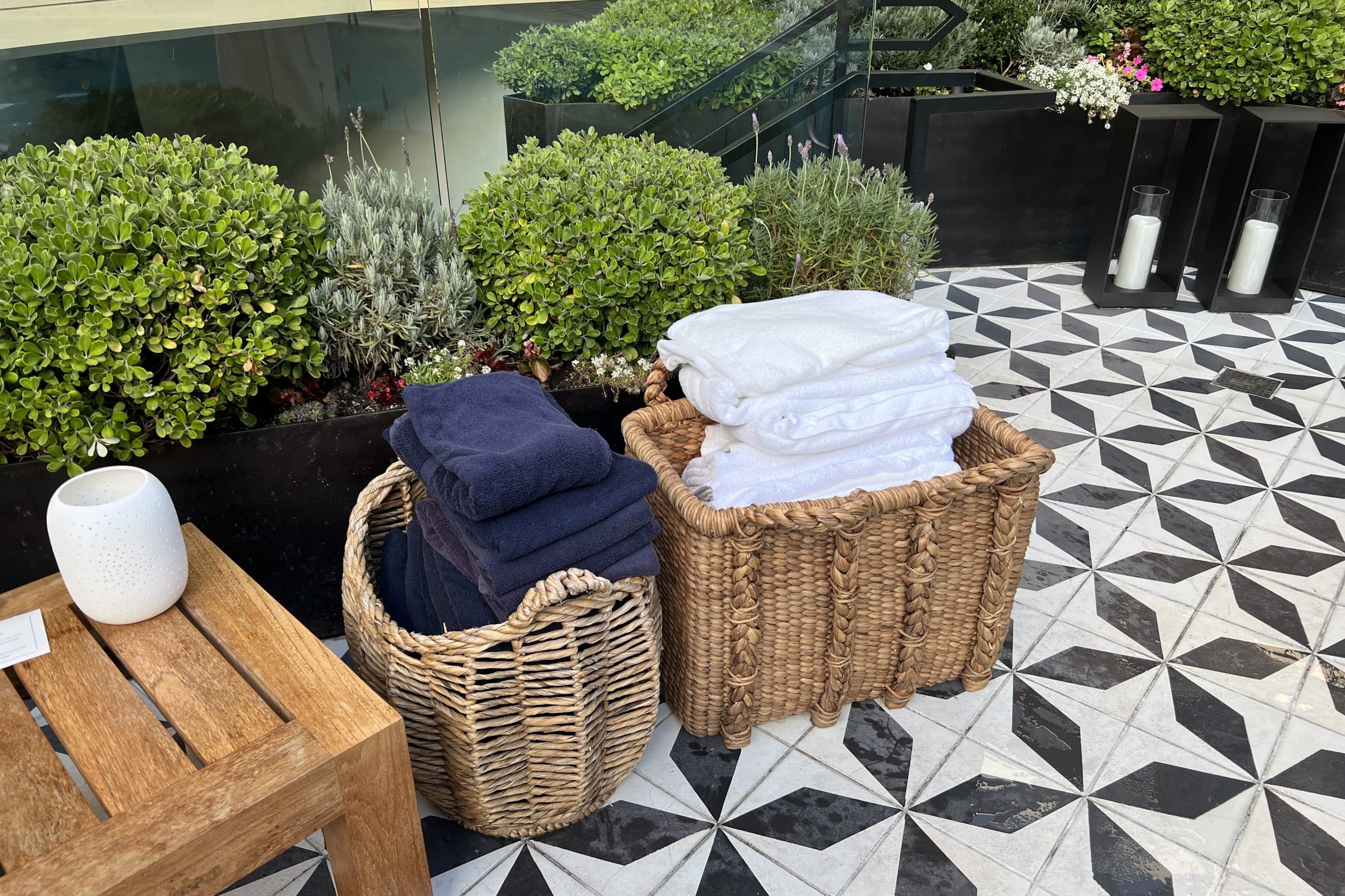 Towels are located in baskets in the far corner of the pool deck, while a water station is located in another corner.