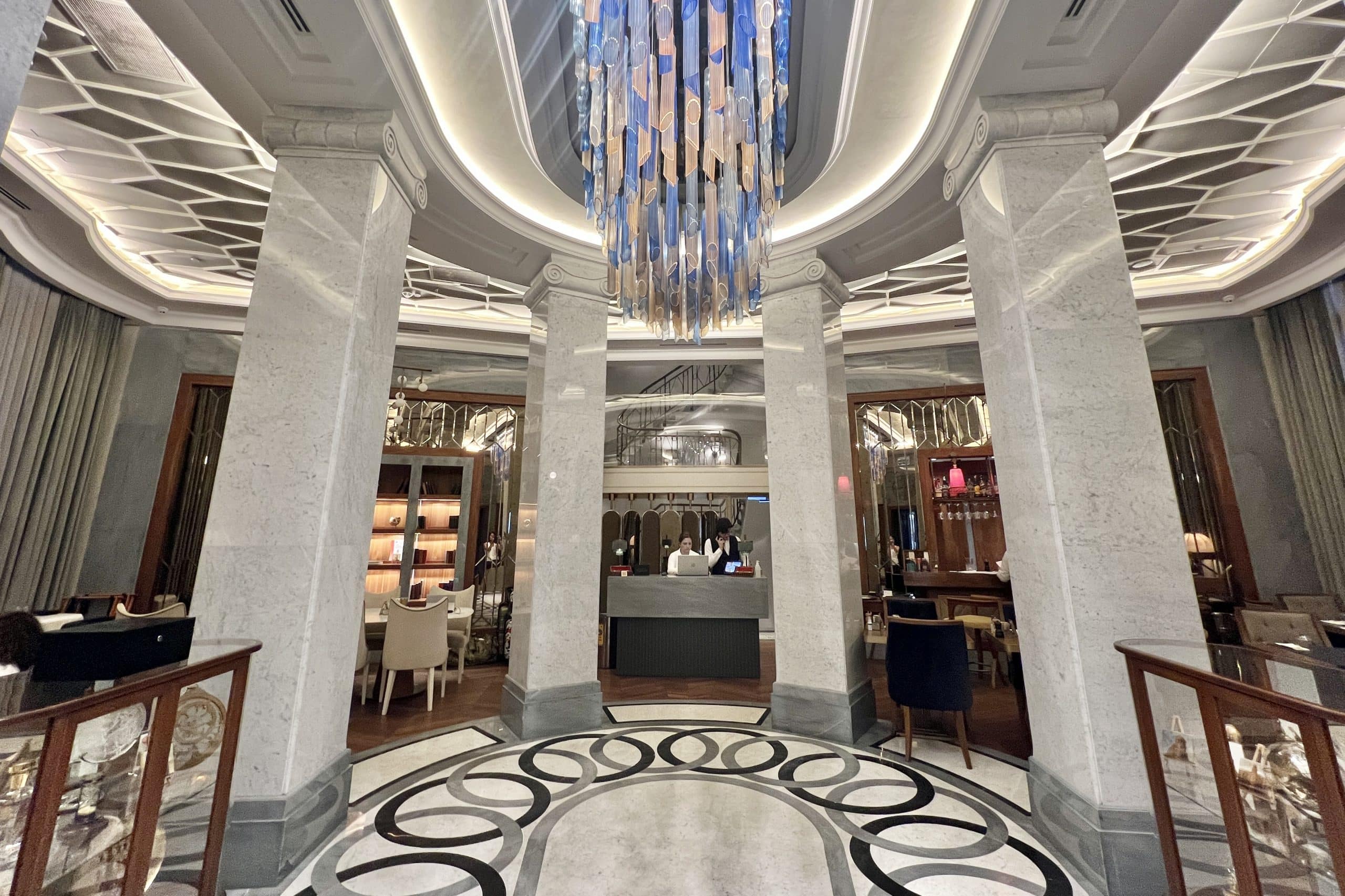 Entering the hotel, you walk up a set of marble steps, through a set of double doors into a classy lobby of marble floors and pillars, with a large glass light fixture hanging from the ceiling.