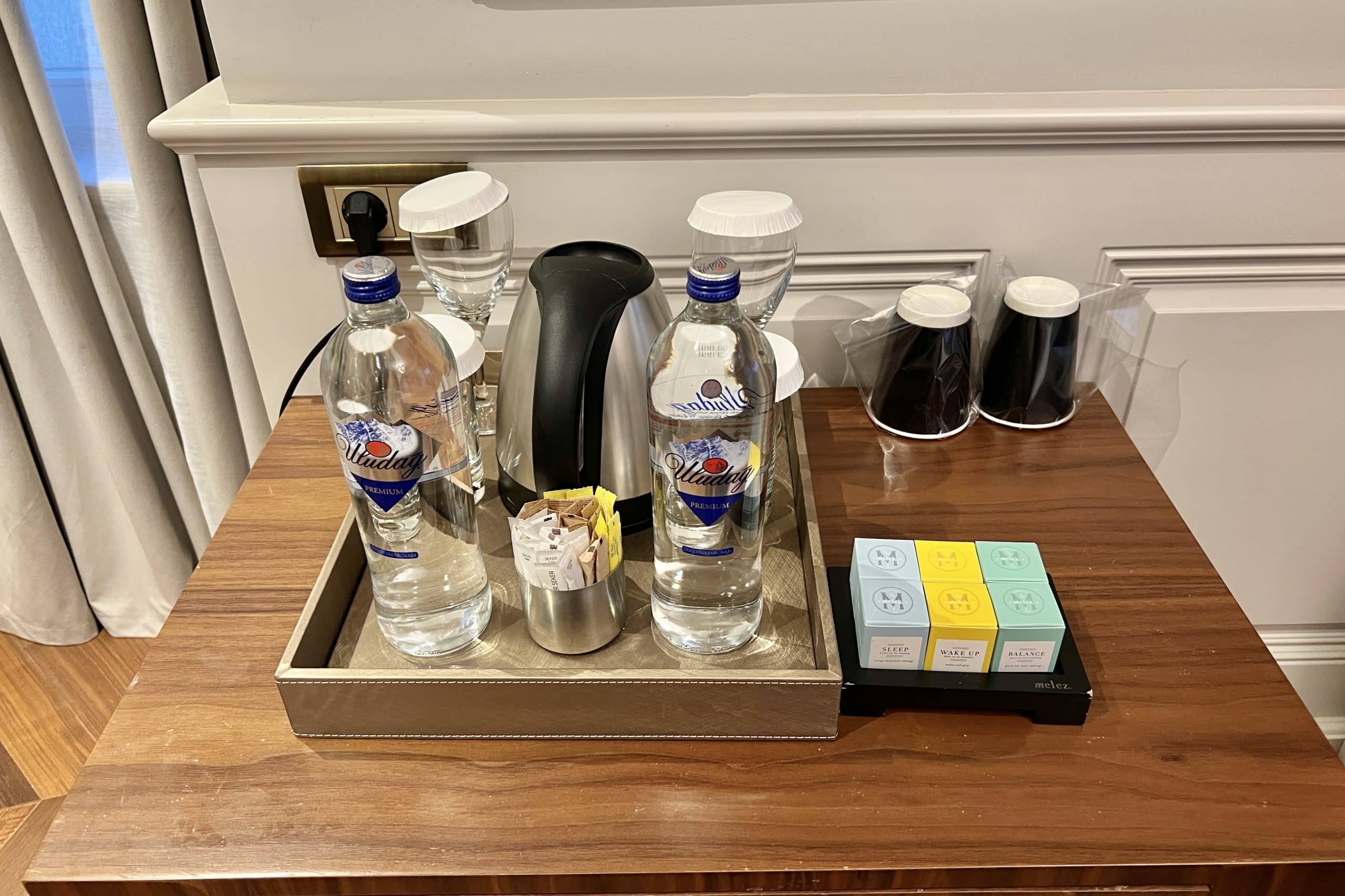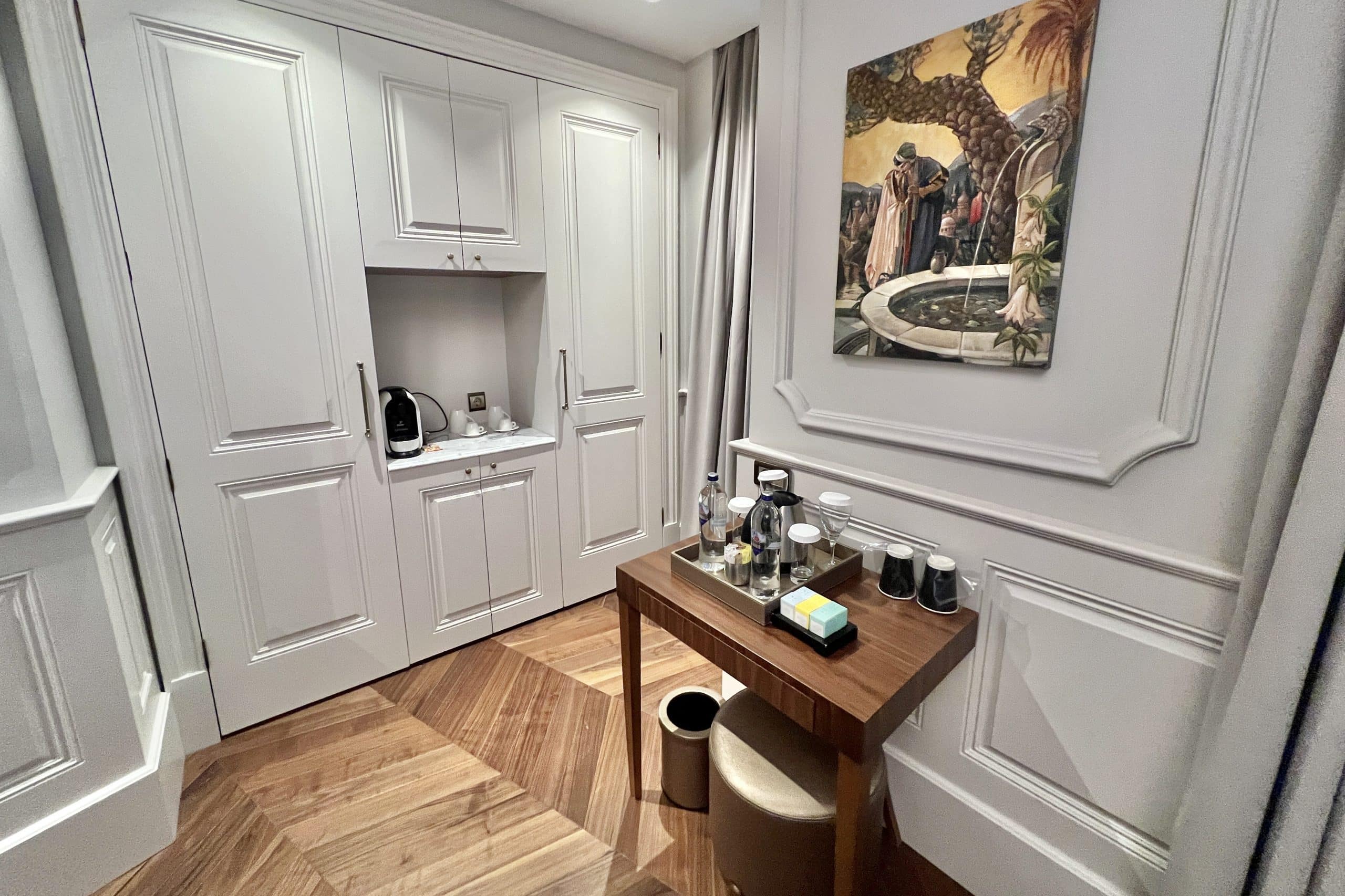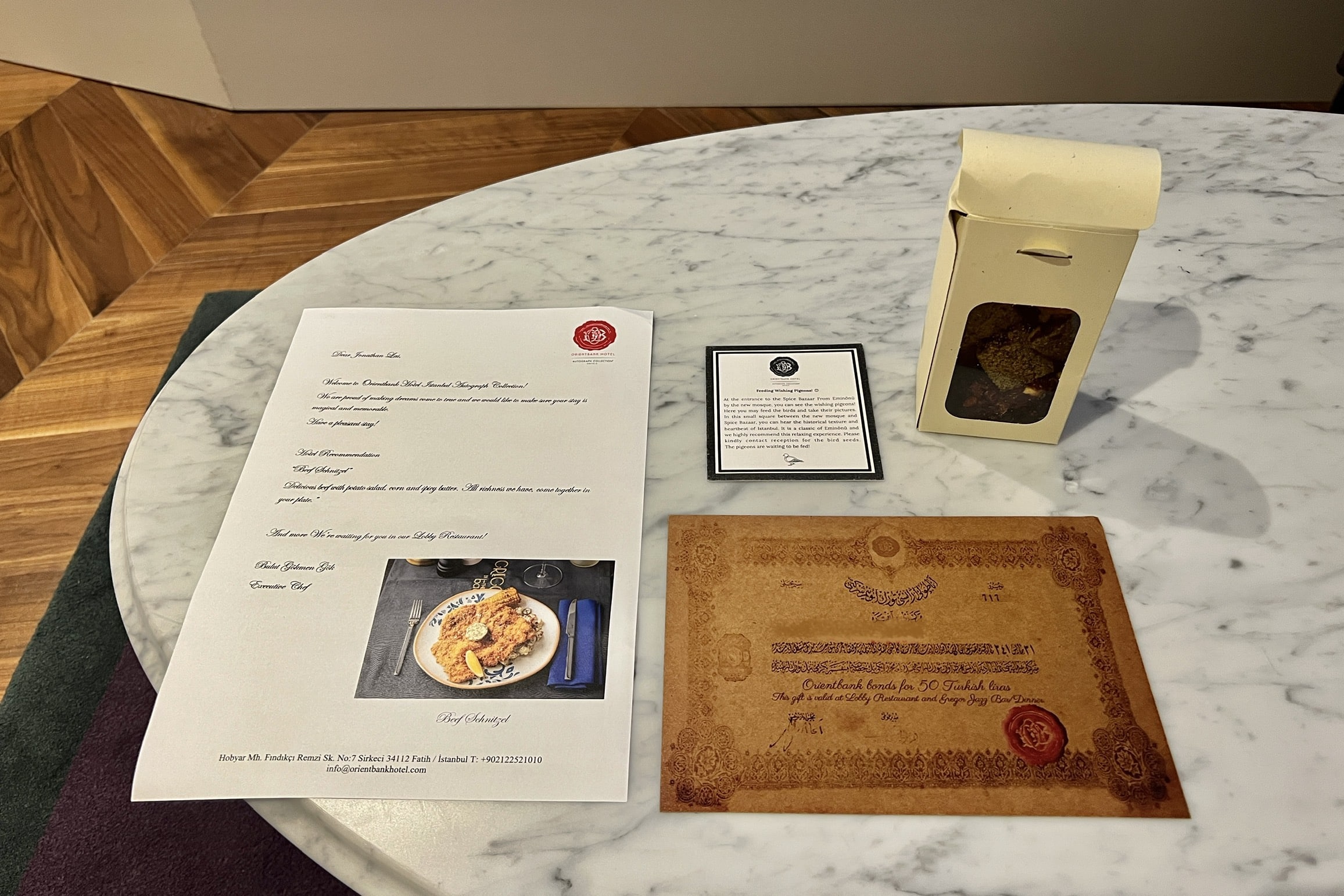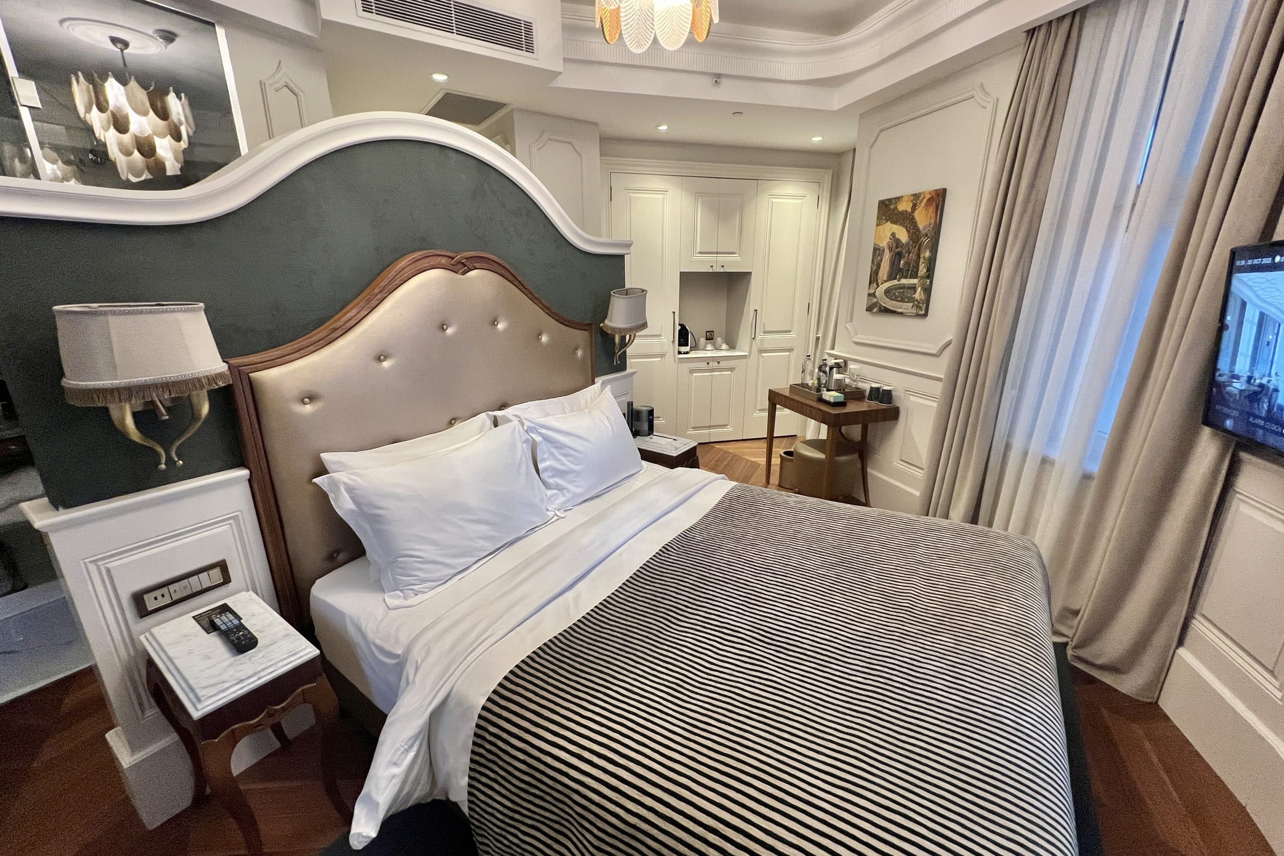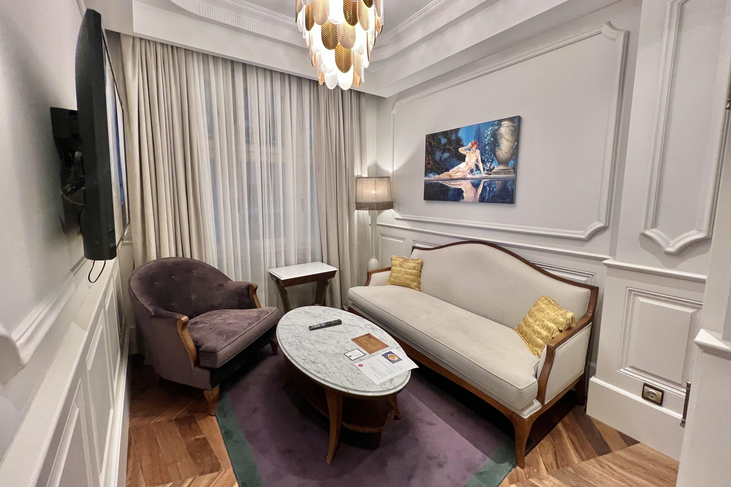 Once we entered our room, the staff member explained the features of the room to us. He also pointed out some welcome amenities: a package of Turkish delights and dried fruit, and also a bank note made to be a replica of those that were once given out by the bank.