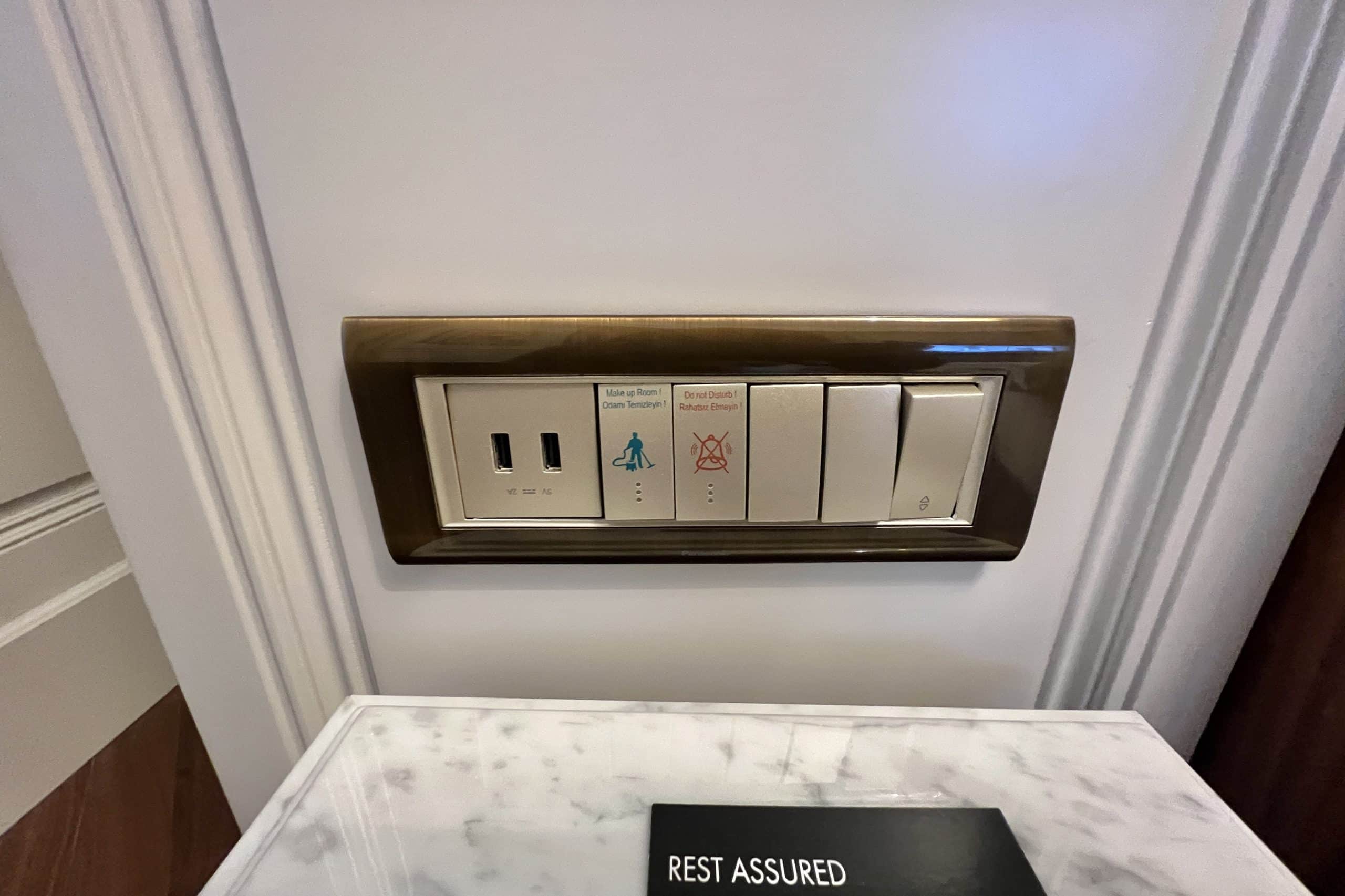 The bed is flanked by a couple of marble-topped night tables. Above these were switches for lights and also USB ports, which makes charging devices convenient.