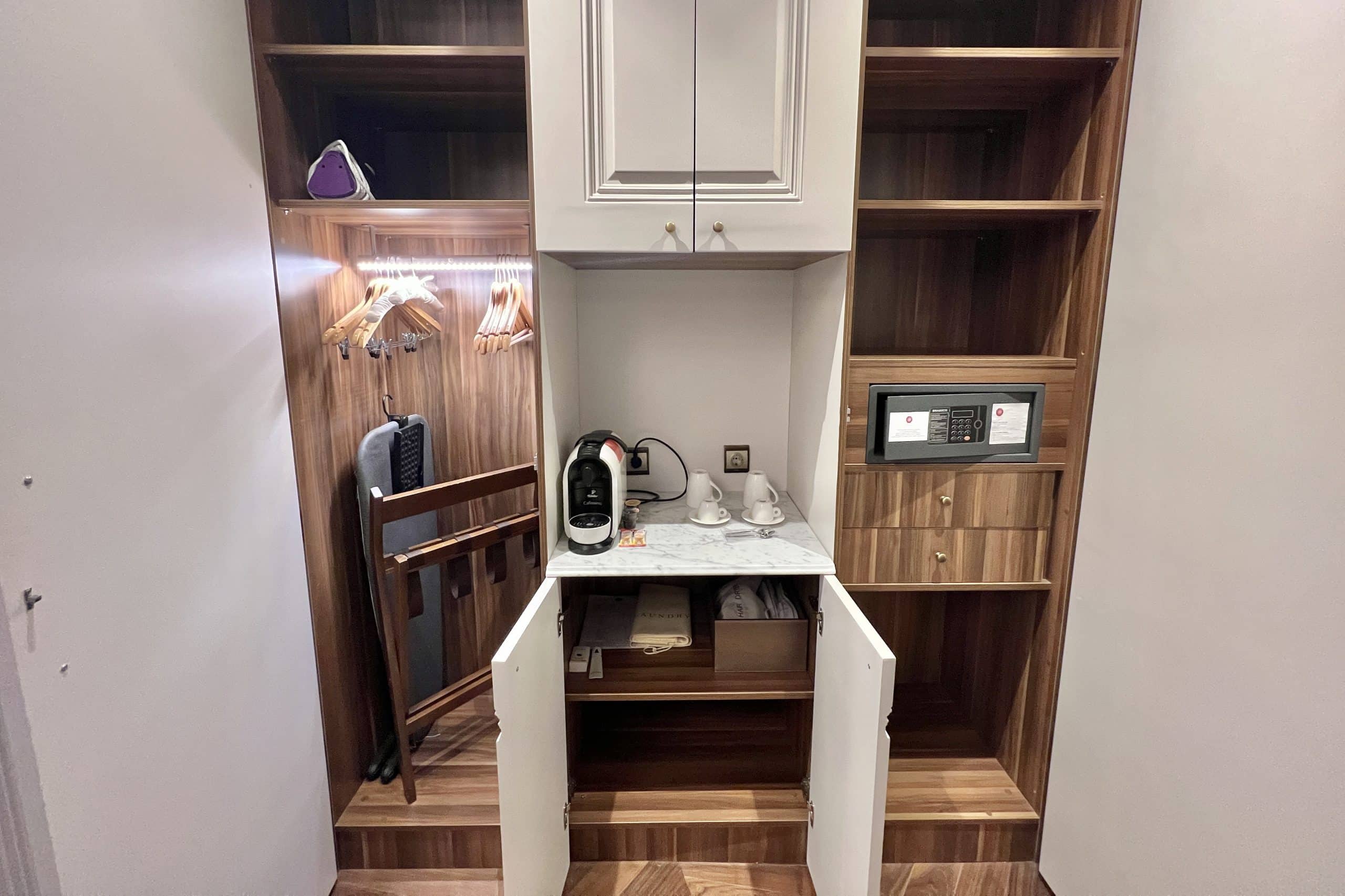 Behind the bed is a closet containing shelves, drawers, a safe, iron, and ironing board. A separate coffee station can also be found here.
