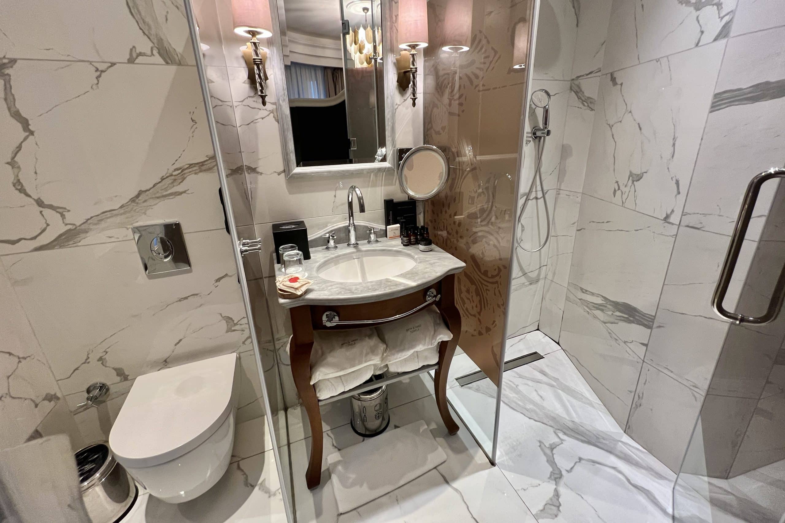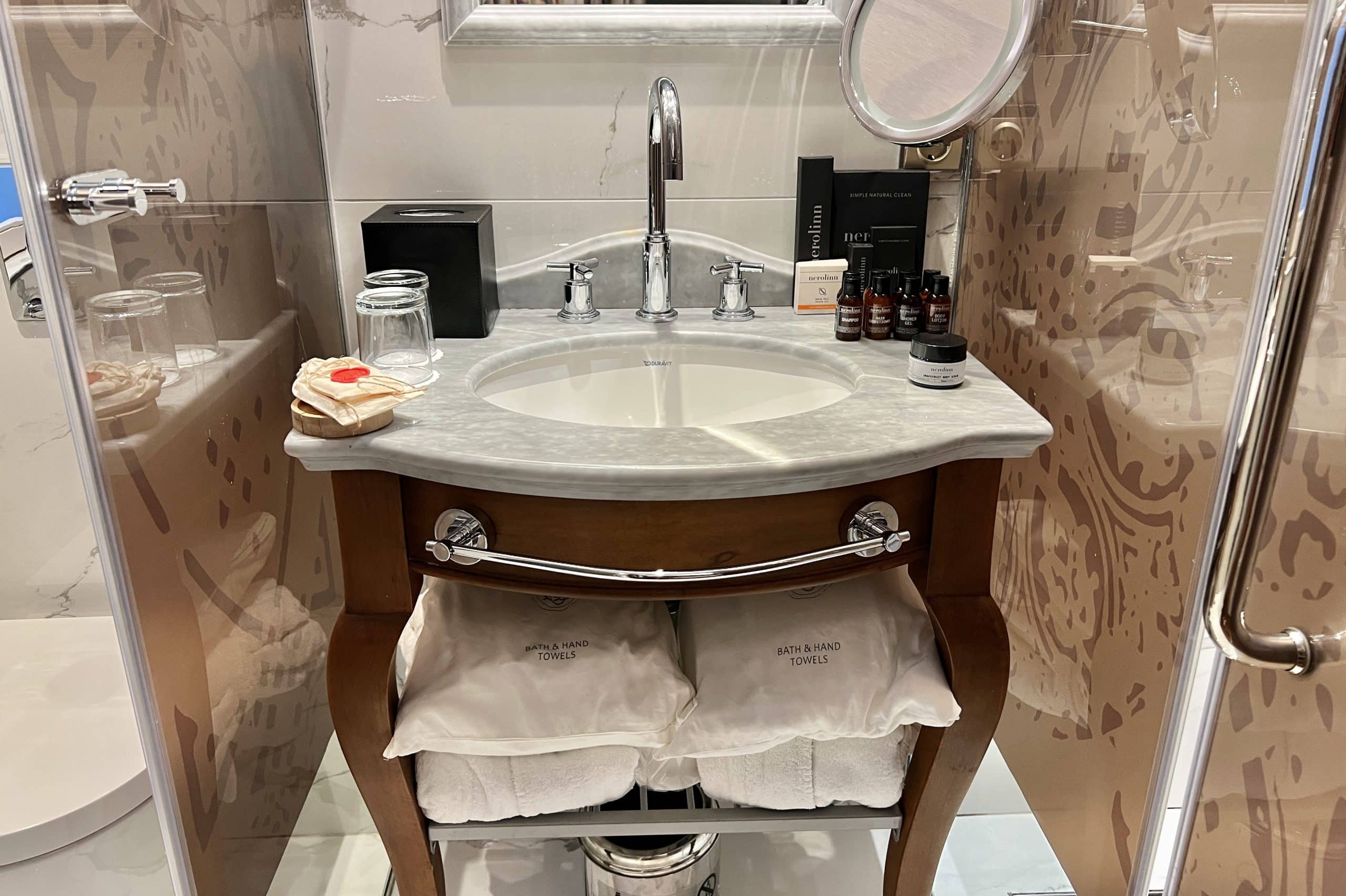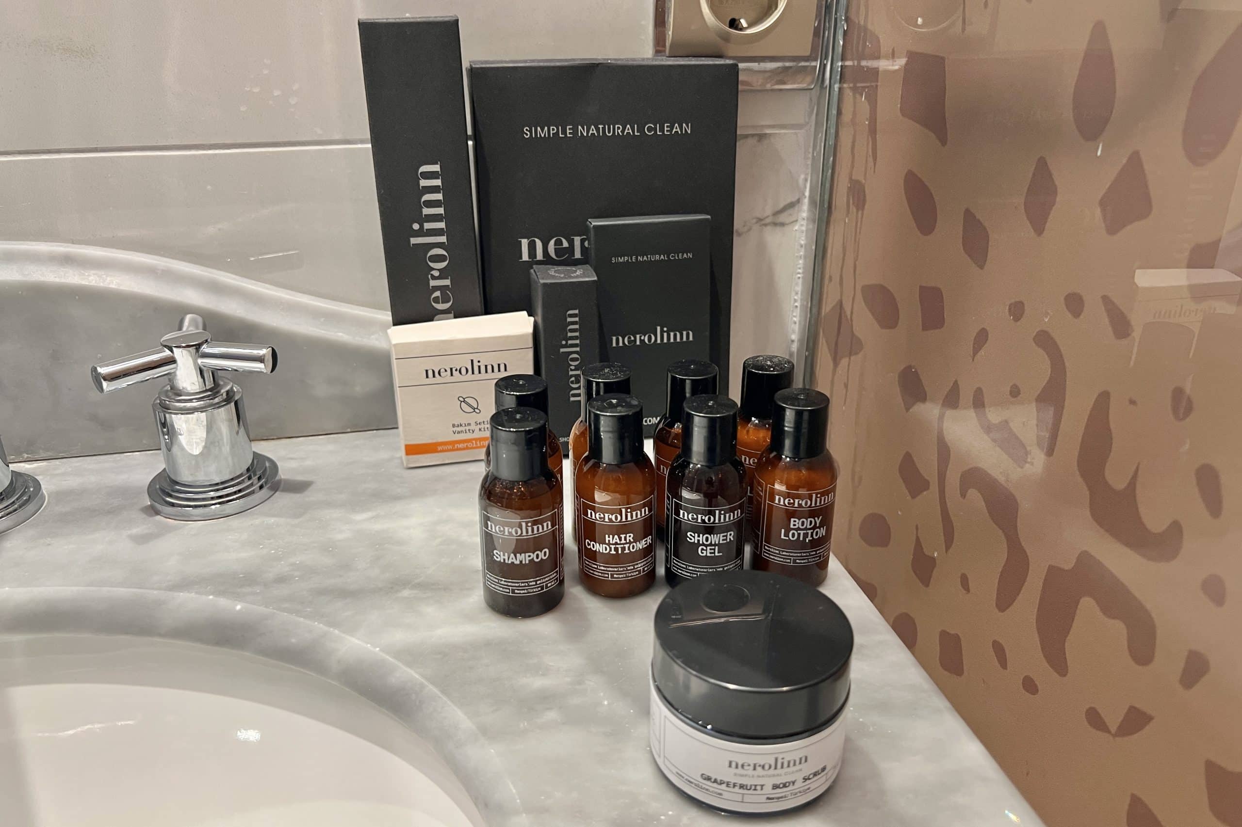 For a tiny vanity, it was packed full of amenities. There were robes and towels in bags on the shelf below the sink, and on the vanity were the toiletries, supplied by Nerolinn, a Turkish brand.