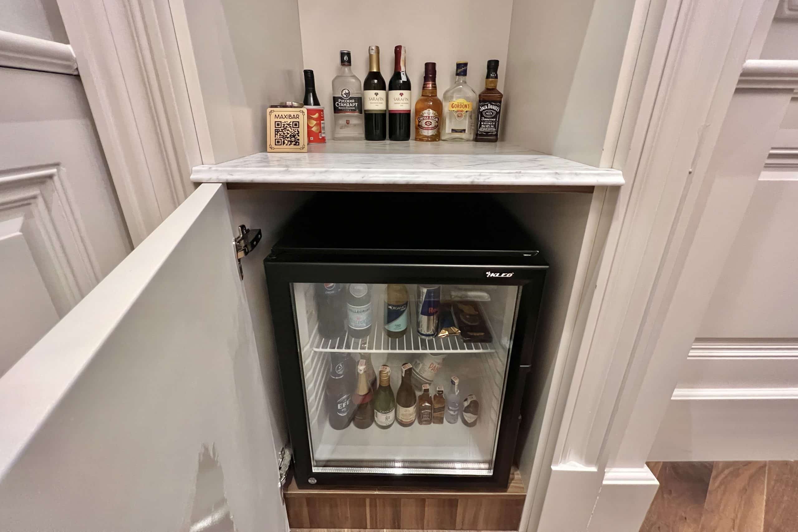 In the corner is a small snack and beverage centre, with some wine, liquors, and snacks on the counter, and a mini-bar containing some more options just below.