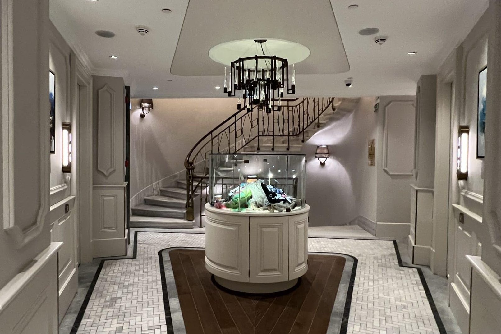 Stepping out of the elevator, you enter into a vestibule with marble tiled floors. In the middle was a glass display showcasing products from a local retailer.