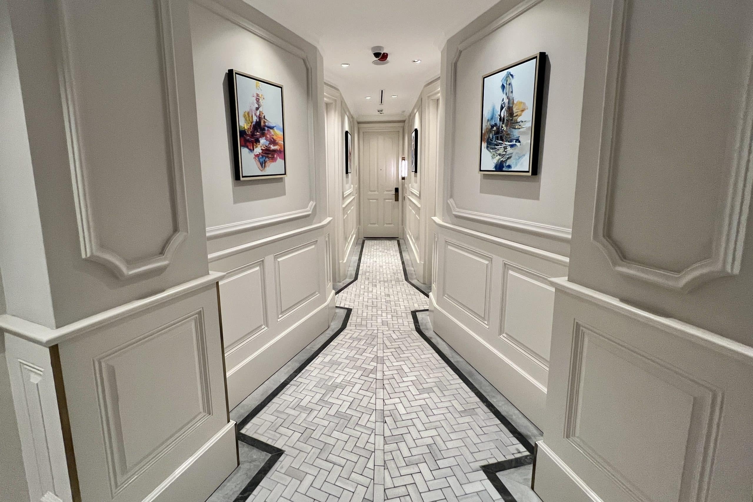 The walls were a bright white with coffering, and decorated with various abstract paintings along the wall.