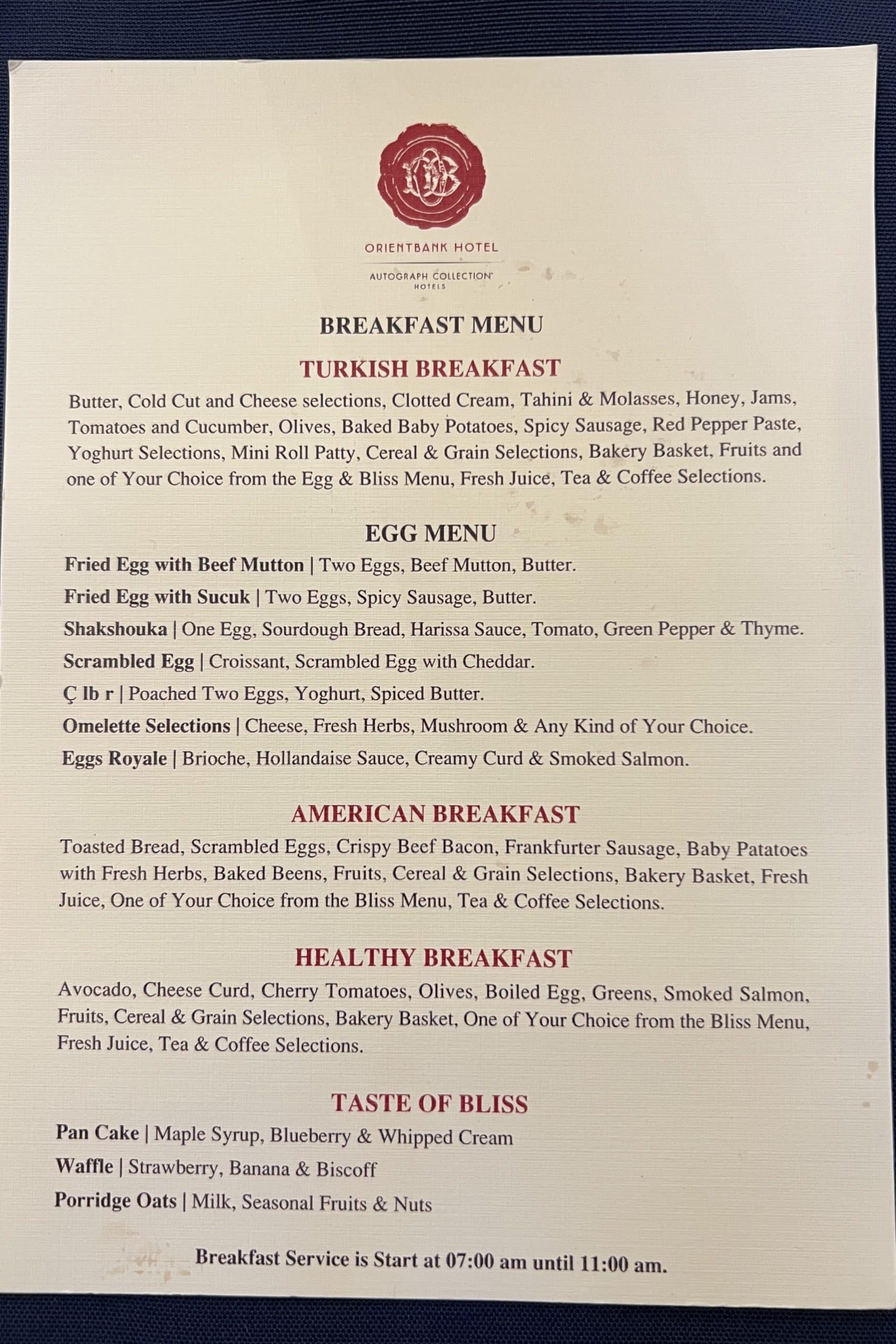 Breakfast is served from 7–11am. They have an à la carte menu which features three types of breakfast: Turkish, American, and healthy.