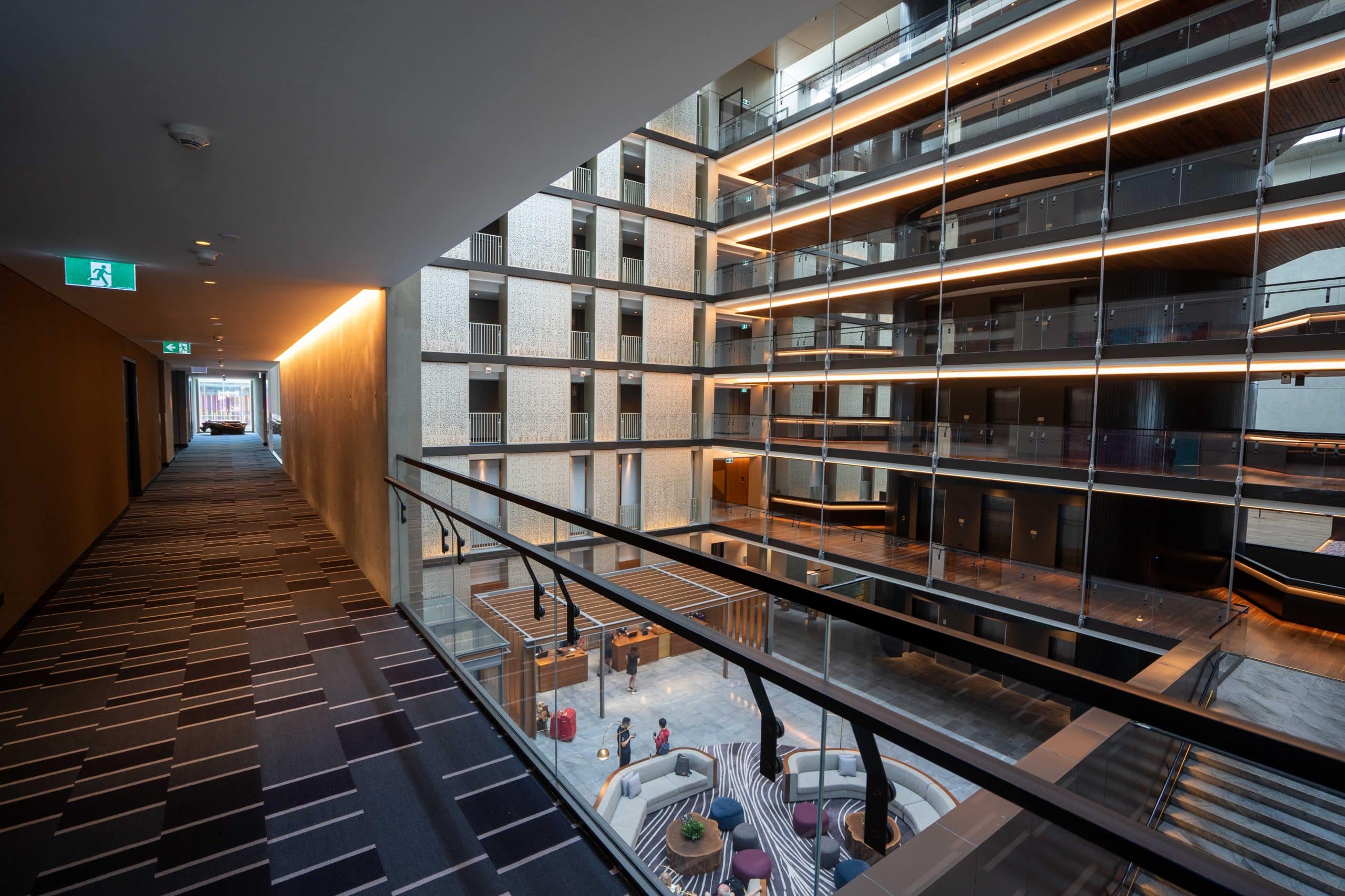 The atrium of the hotel incorporates elements inspired by the Māori. Irregularly shaped fins extend upwards on both sides of the atrium, and overhead, and the spaces between these fins are glazed. This enables natural daylight to illuminate the interior as it moves throughout the day.