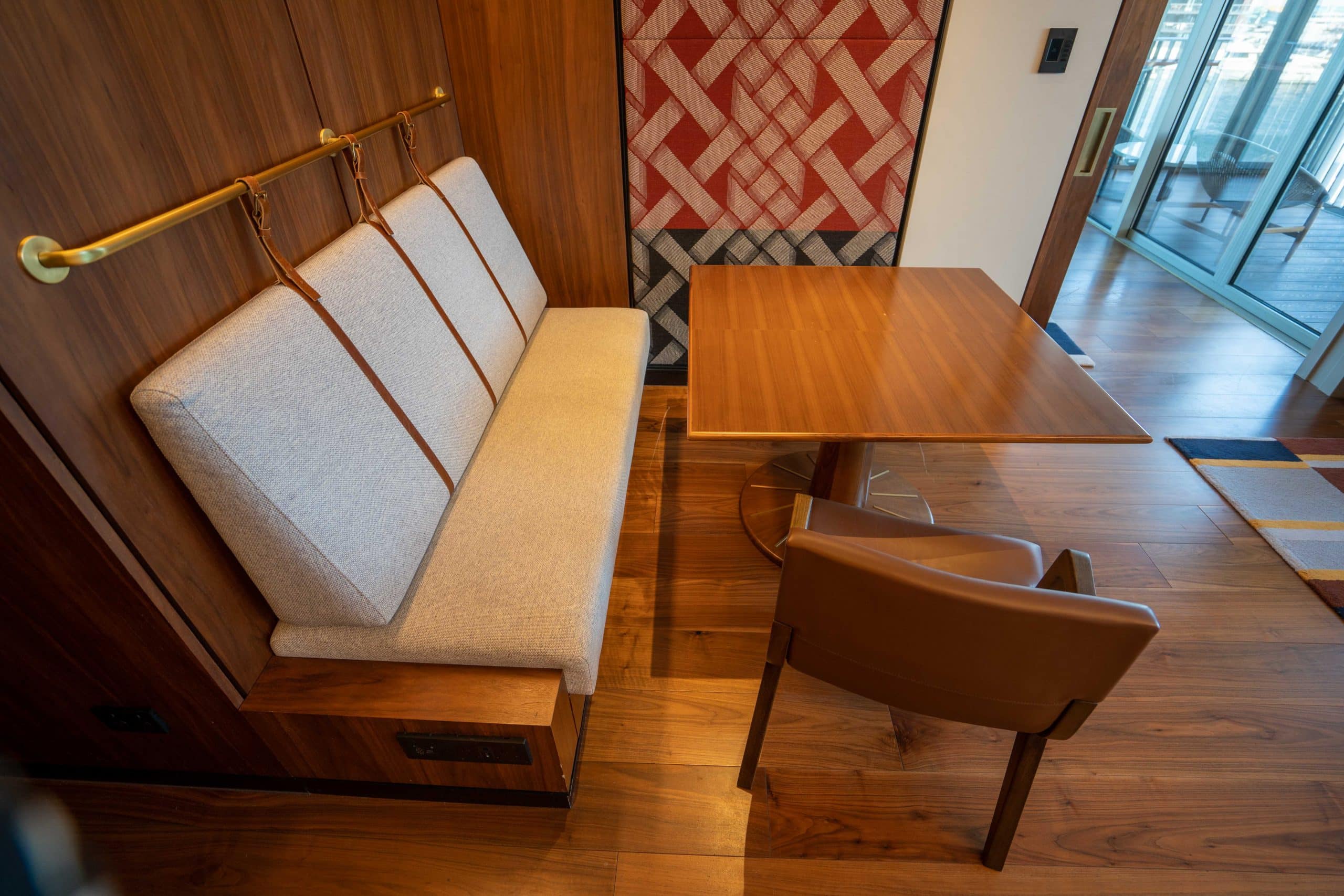Adjacent to the seating area, there’s a delightful dining nook furnished with a bench and side chair, which also serves as a practical workspace. Conveniently integrated into the vertical surface of the bench were charging outlets and USB ports.