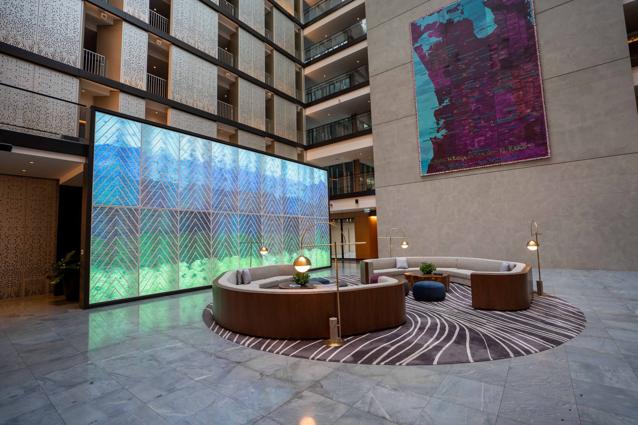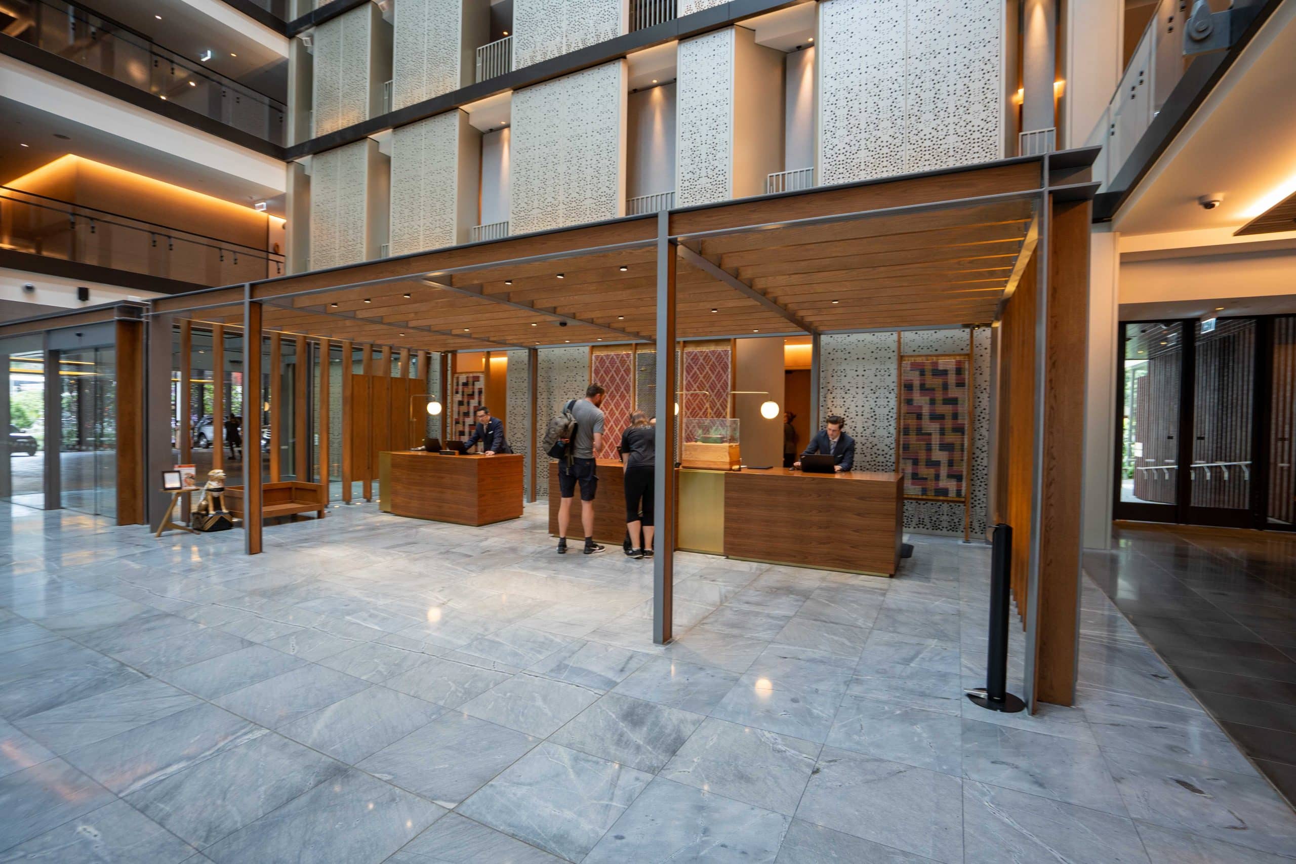 The front of the lobby is where the check-in and the concierge desks are located, while towards the back is an open-air event space.