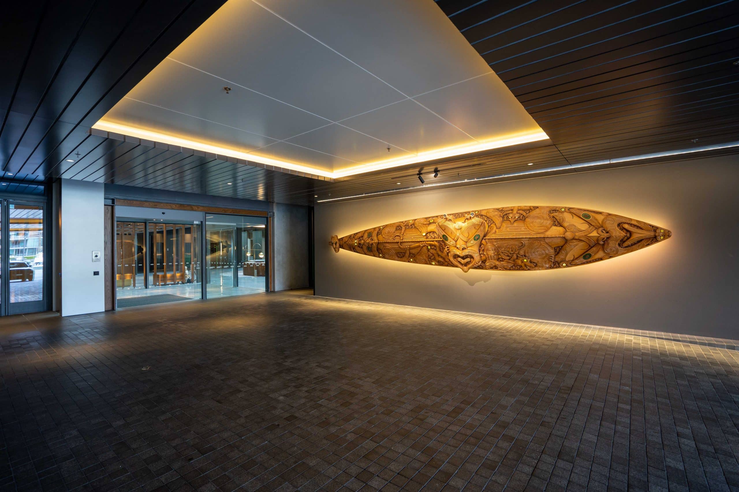 The hotel showcases numerous works of art. The first piece of Māori artwork is the hotel’s façade, while the second installation occupies the entrance wall – a wooden waka by Lyonel Grant, a renowned New Zealand Māori master carver and sculptor.