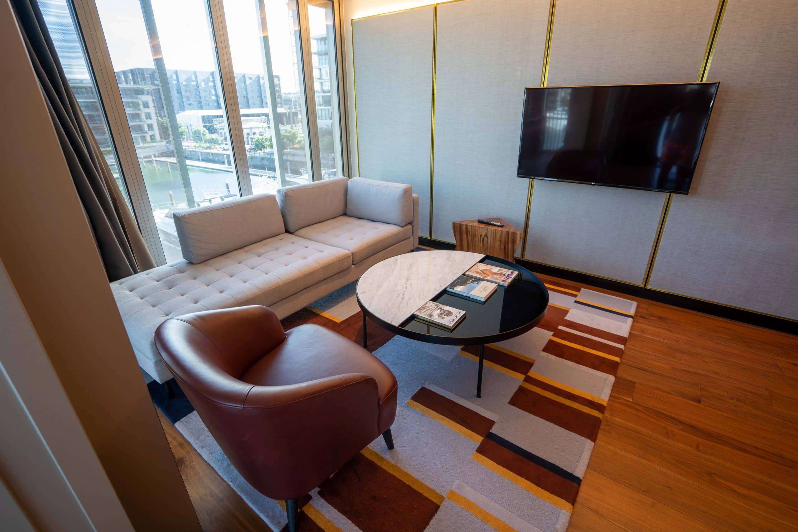 As you step into the suite, you’ll be welcomed by a sleek open concept living area, elegantly furnished with plush seating arrangements and a generously sized dining table that can comfortably accommodate up to six people.