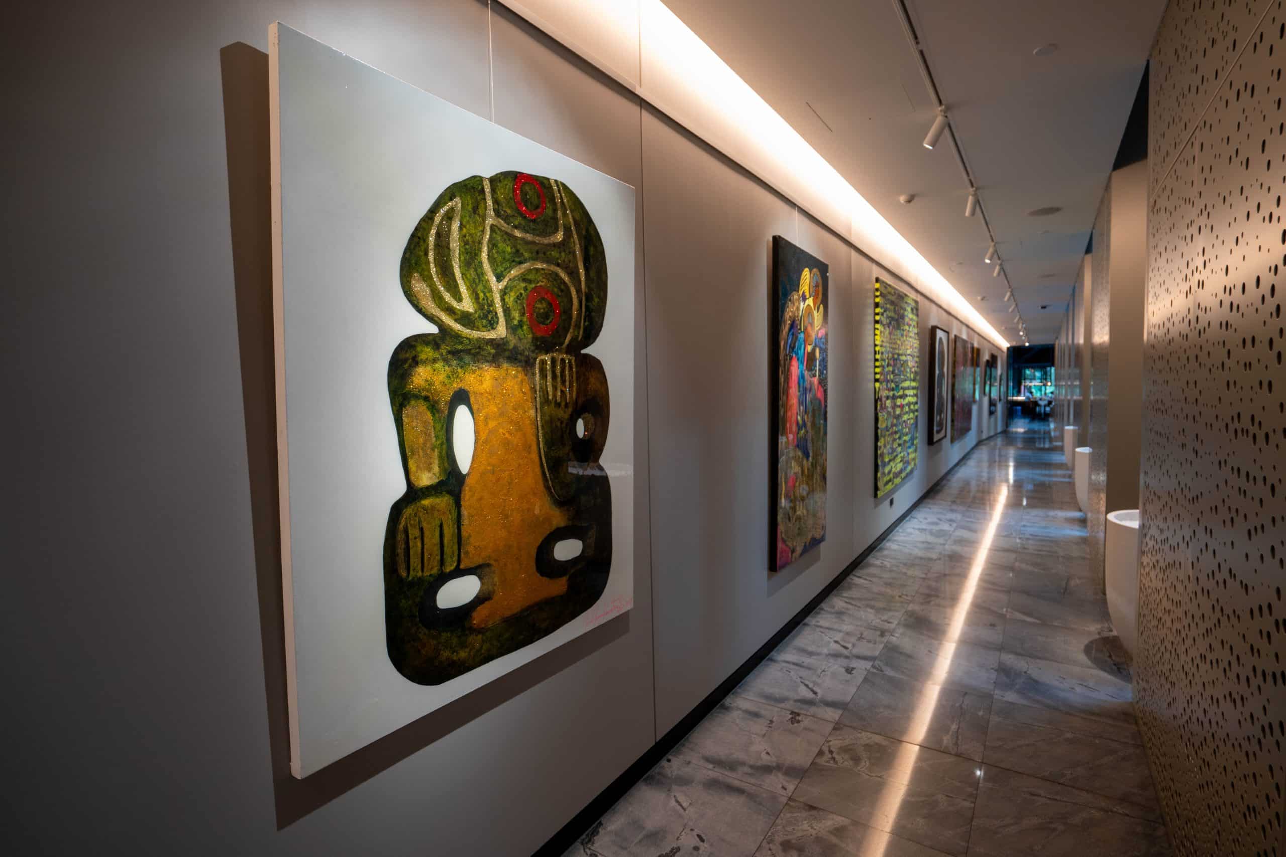 The lobby is outright striking, with tukutuku panels and a multi-coloured art display by artist Peata Larkin. This backdrop features painted woven patterns that are illuminated with LED lighting to echo Māori weavings.