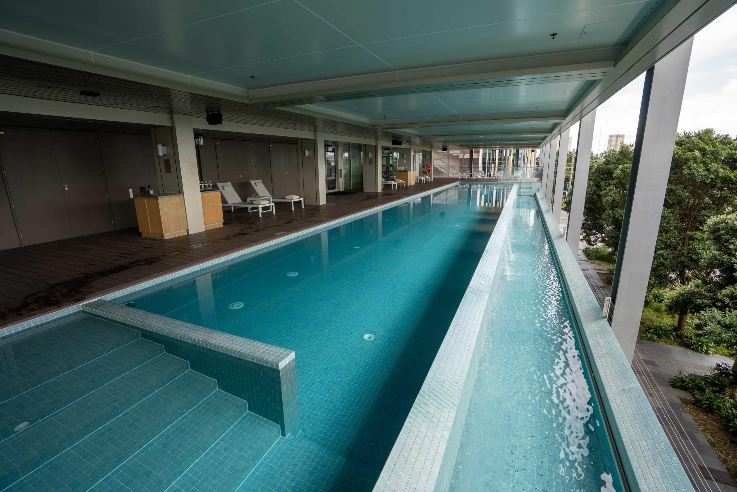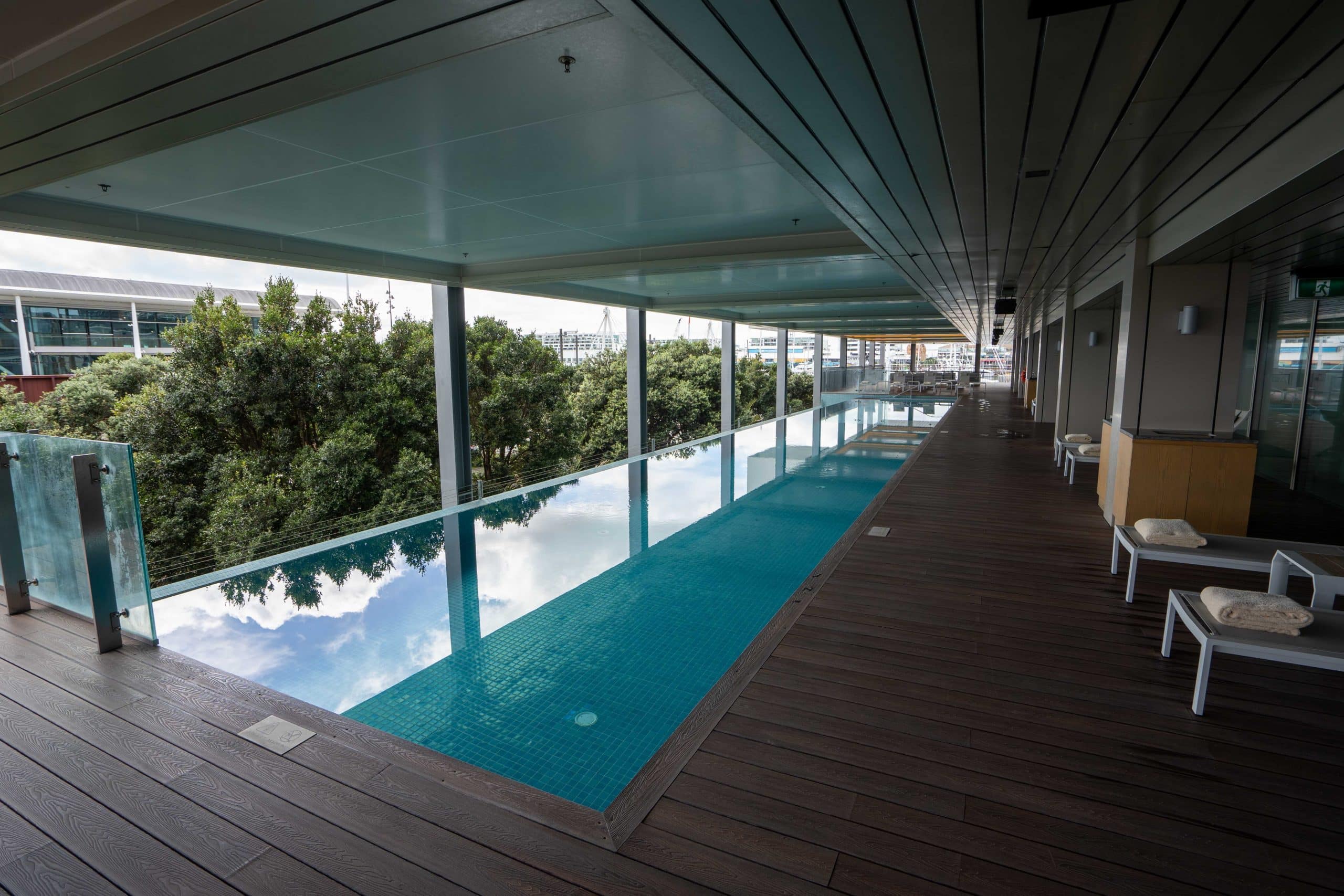 The pool at the Park Hyatt Auckland is a 25-metre, partially outdoor infinity pool with sweeping views of Wynyard Quarter’s Lighter Basin, open from 6:20am–9:30pm daily.