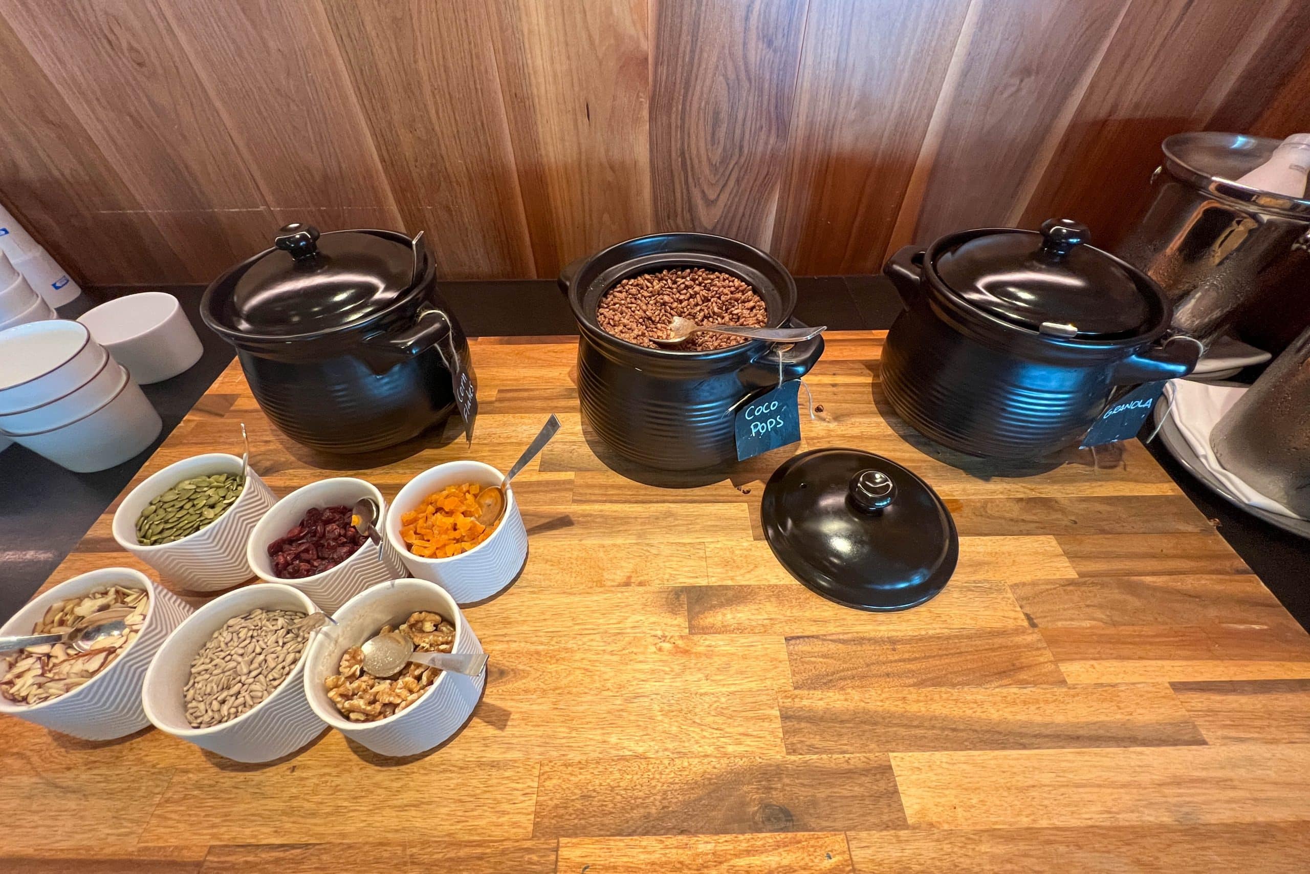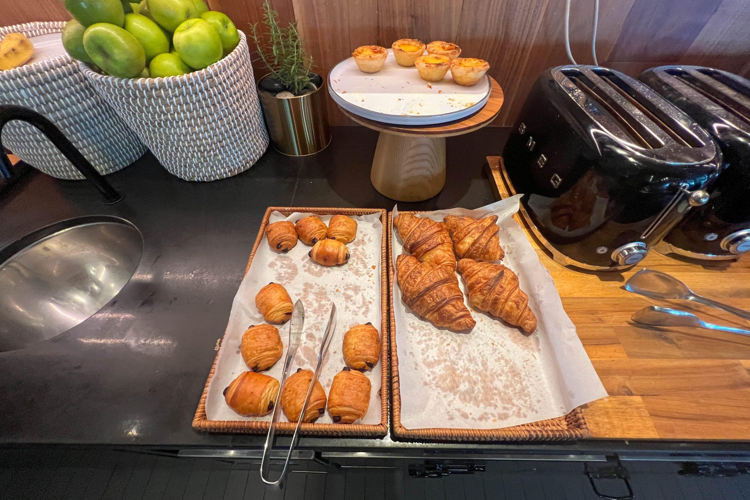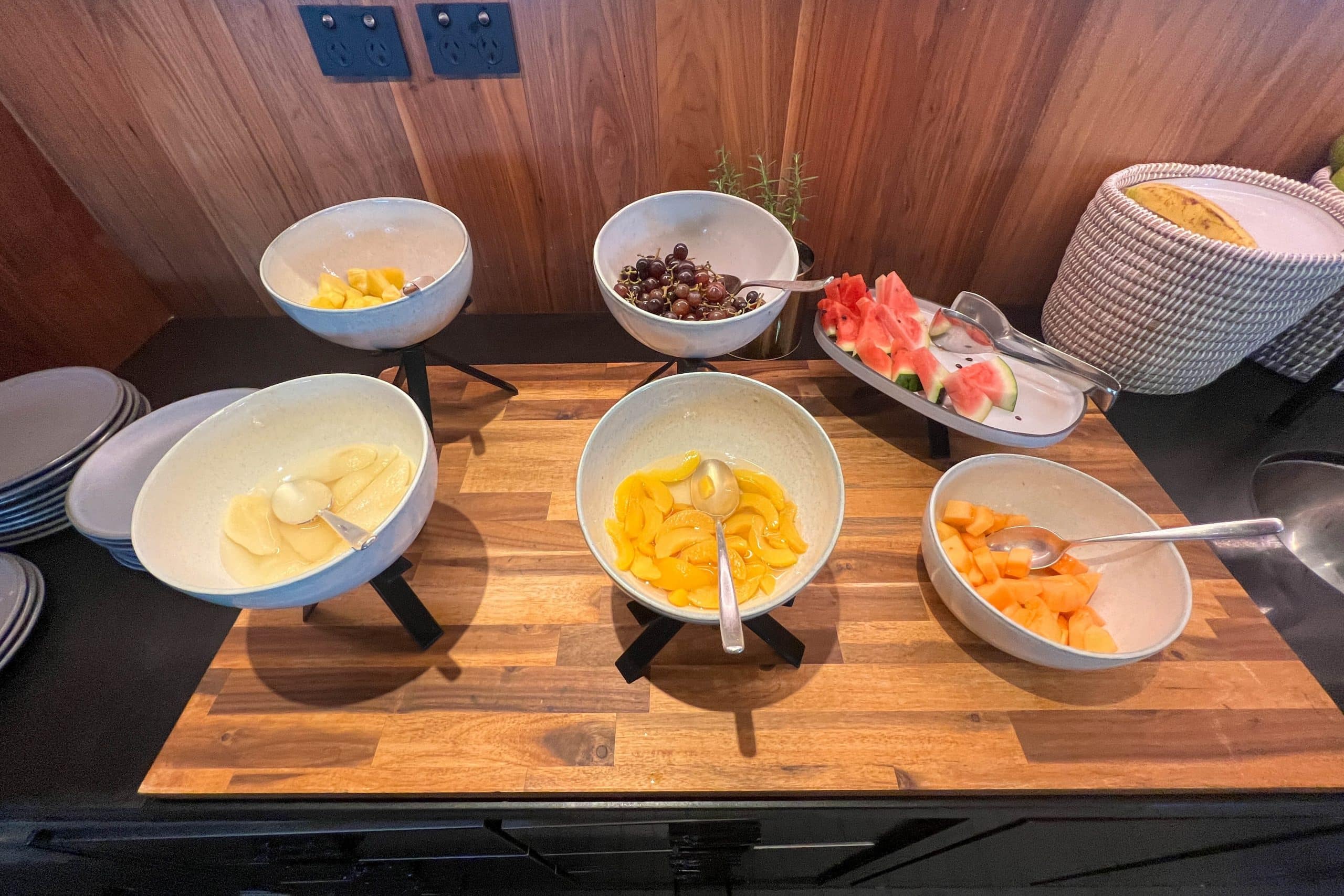 As a Globalist member, I enjoyed a complimentary breakfast benefit. At Onemata, the breakfast options consisted of a limited buffet with typical items like cereal, pastries, cheese, cured meats, fruits, yogurt, juice, as well as self-serve coffee and tea.