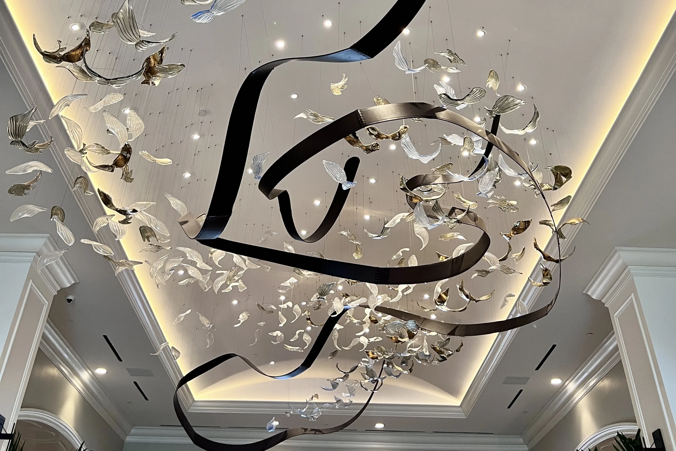 Decorated in soft shades of beige and grey with dark accents, the most eye-catching piece in this area is the massive chandelier overhead, comprised of glass birds in simulated flight.