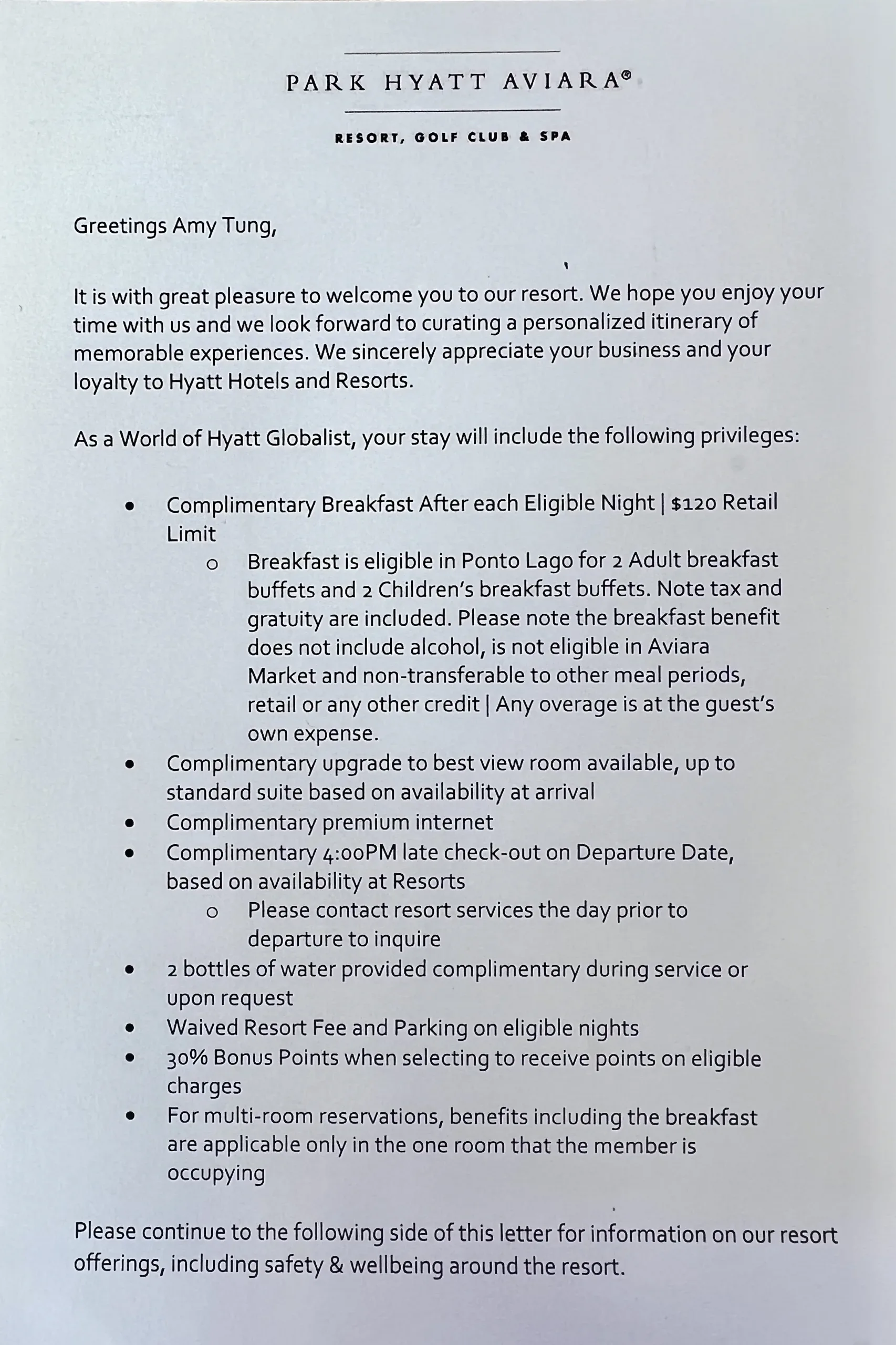 An email had been sent out two weeks prior to our check-in requesting guest and arrival information and providing extensive information about the property, including links to register for activities available during our stay. The elite benefits for my Globalist status were also outlined in the email, and at check-in, these benefits were once again clearly presented on a handout.