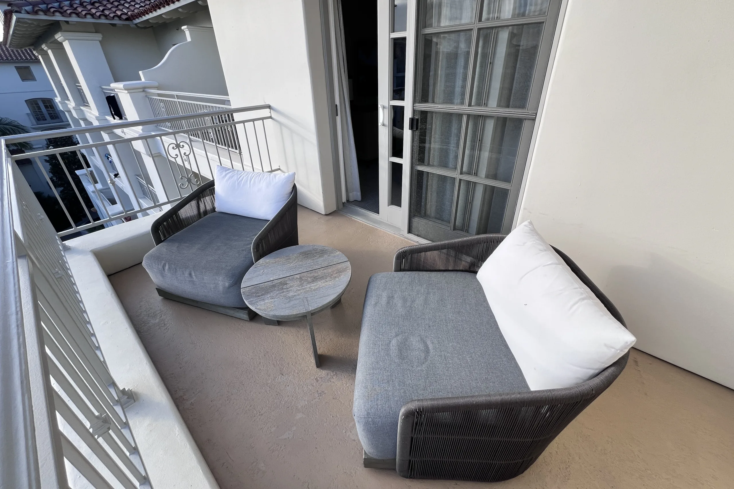 Both the bedroom and the living room had balconies with seating to enjoy the view of the pool below and the ocean view beyond.
