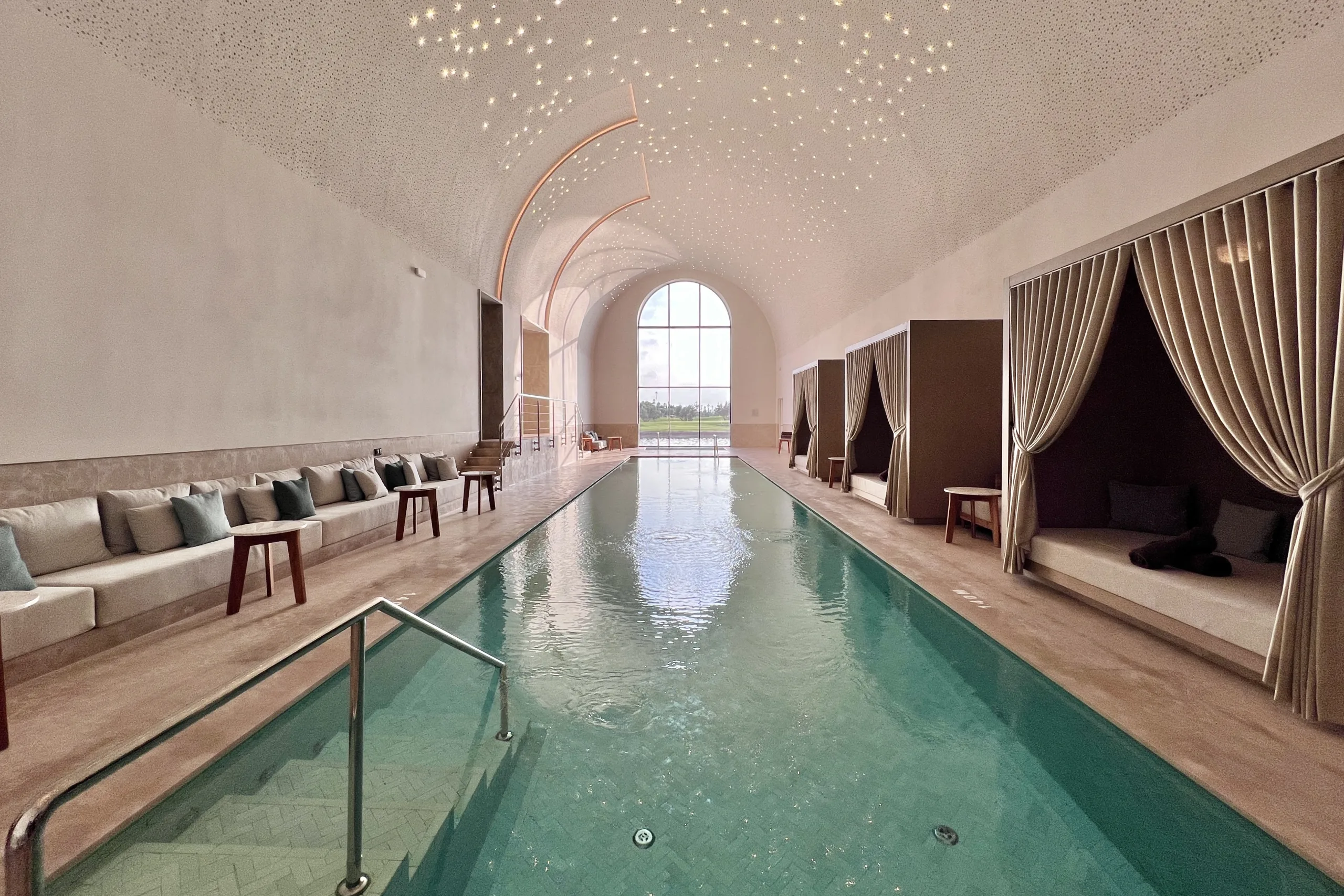 Beneath a glowing ceiling, the warm indoor pool provided a peaceful retreat.