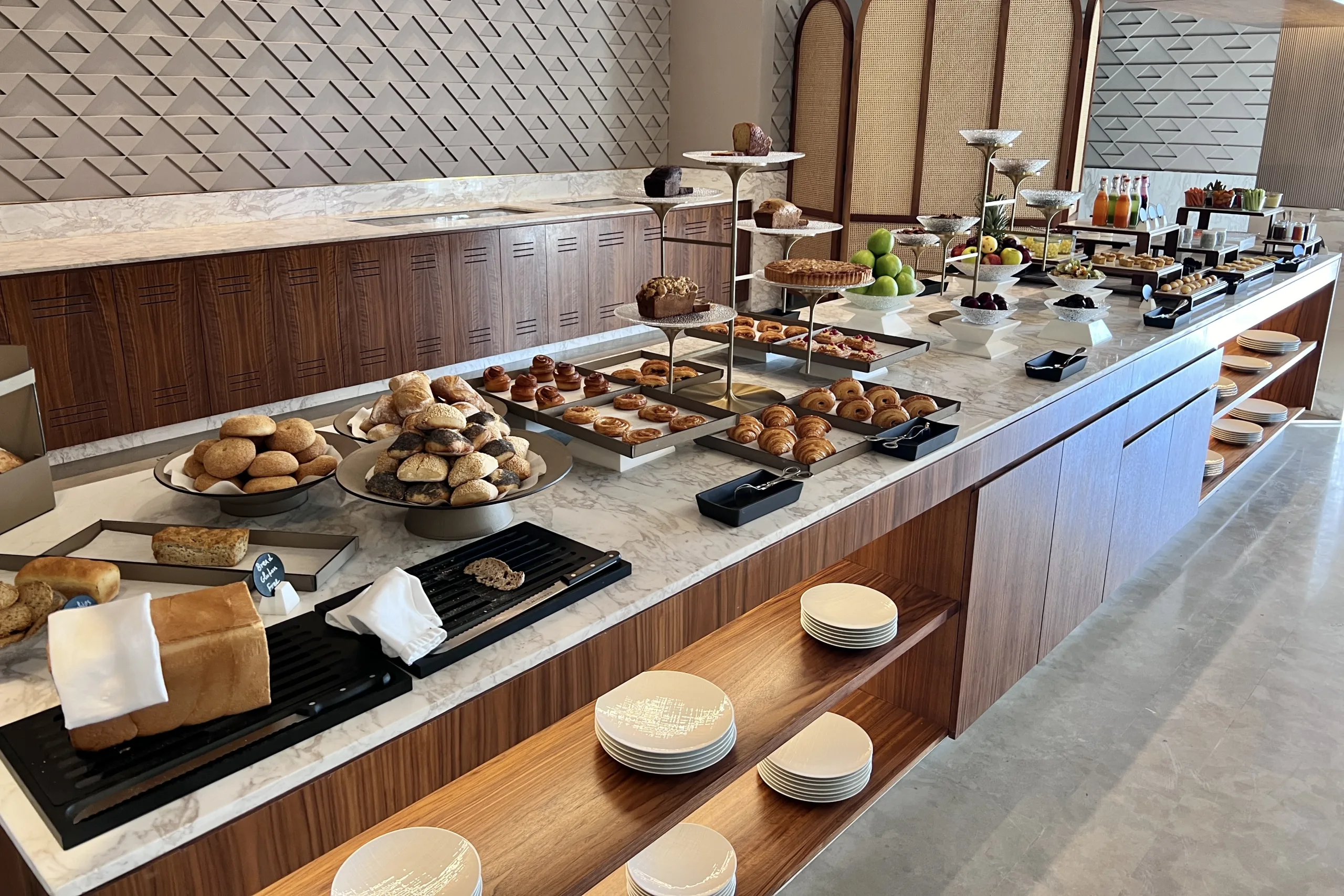 A continental breakfast buffet offered a variety of breads, pastries, fruits, wellness juices, and parfaits.