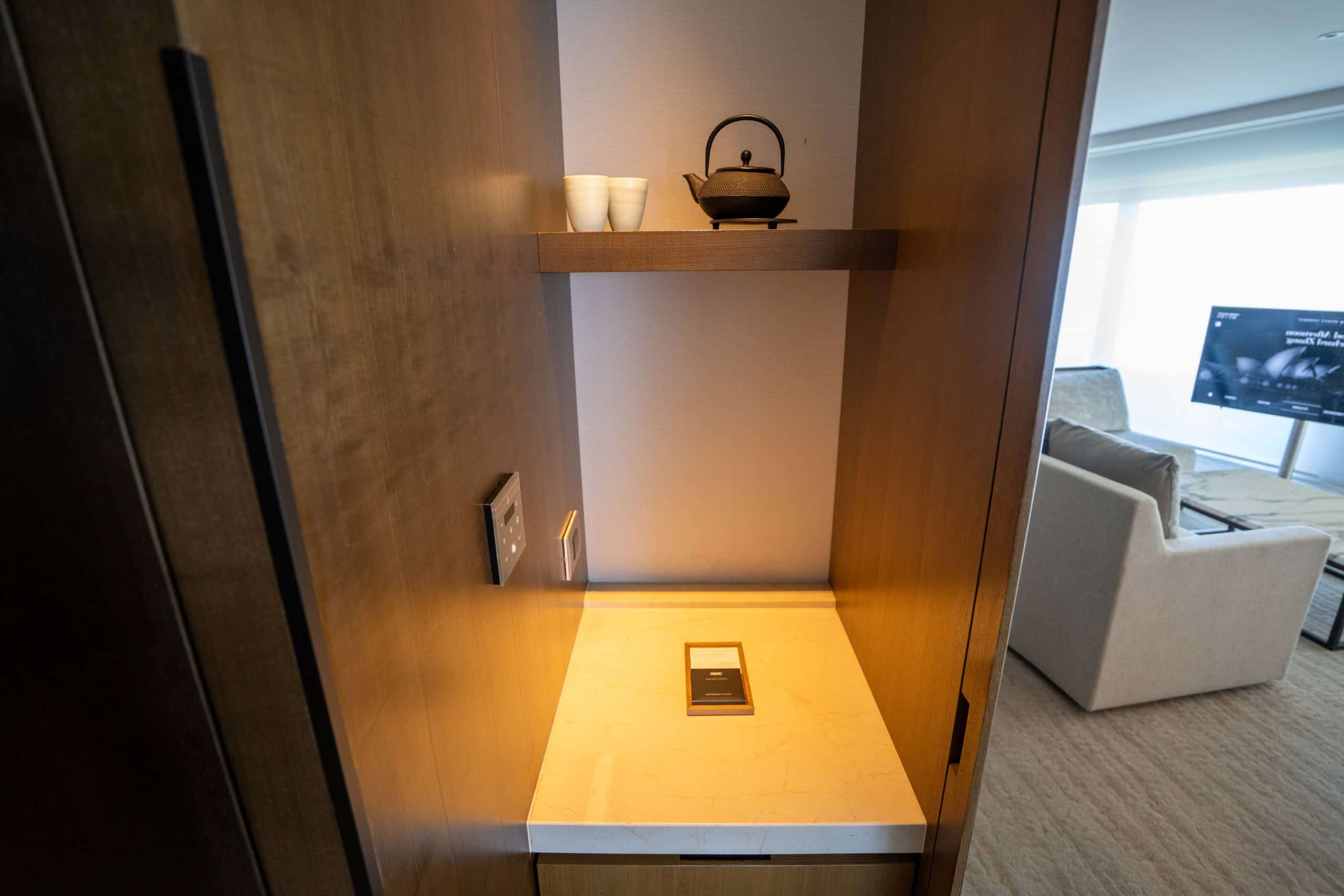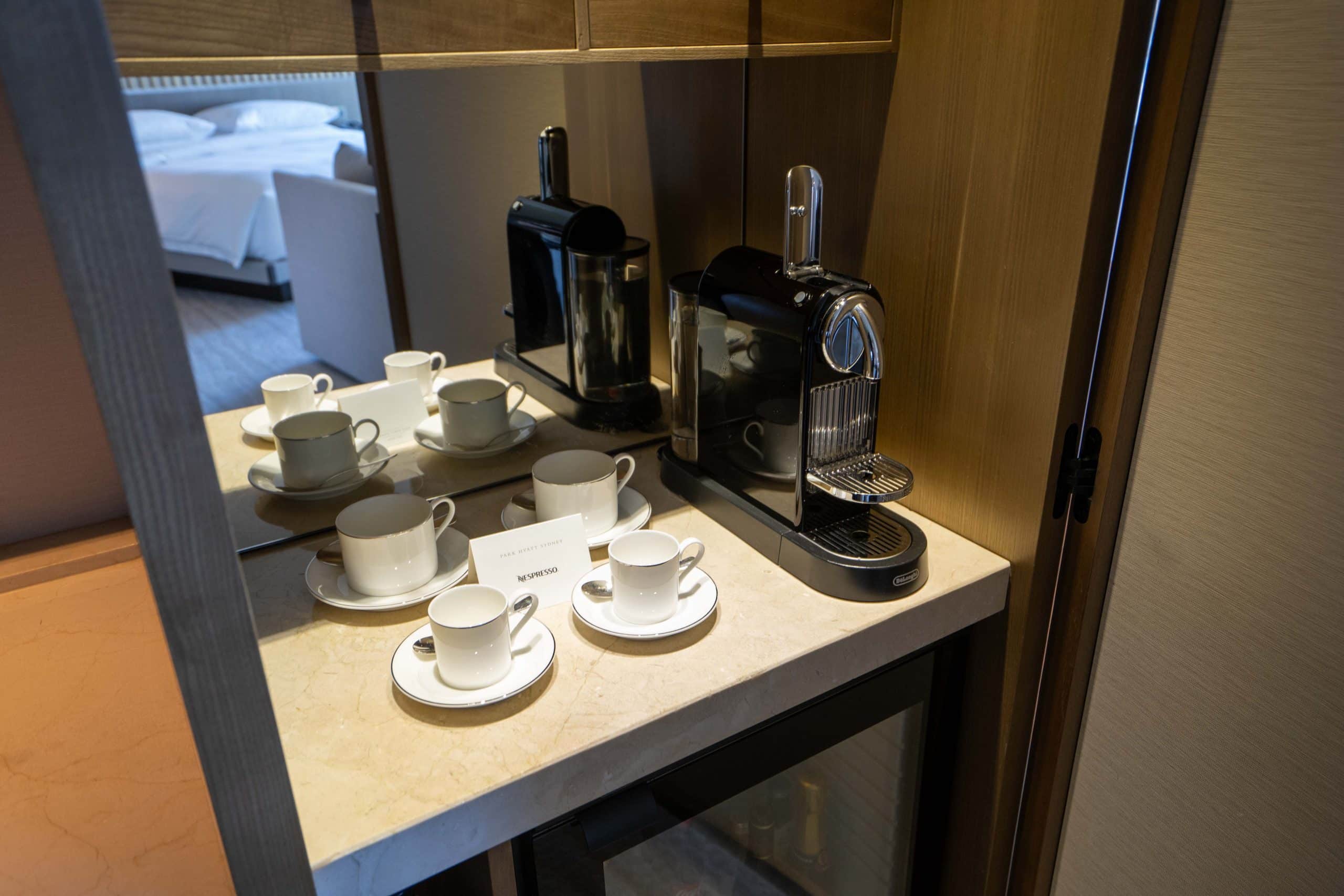 A well-stocked minibar is housed in a full height closet. There’s a selection of spirits, wines, Champagne, and soft drinks, as well as a Nespresso coffee maker located on the lower shelf.