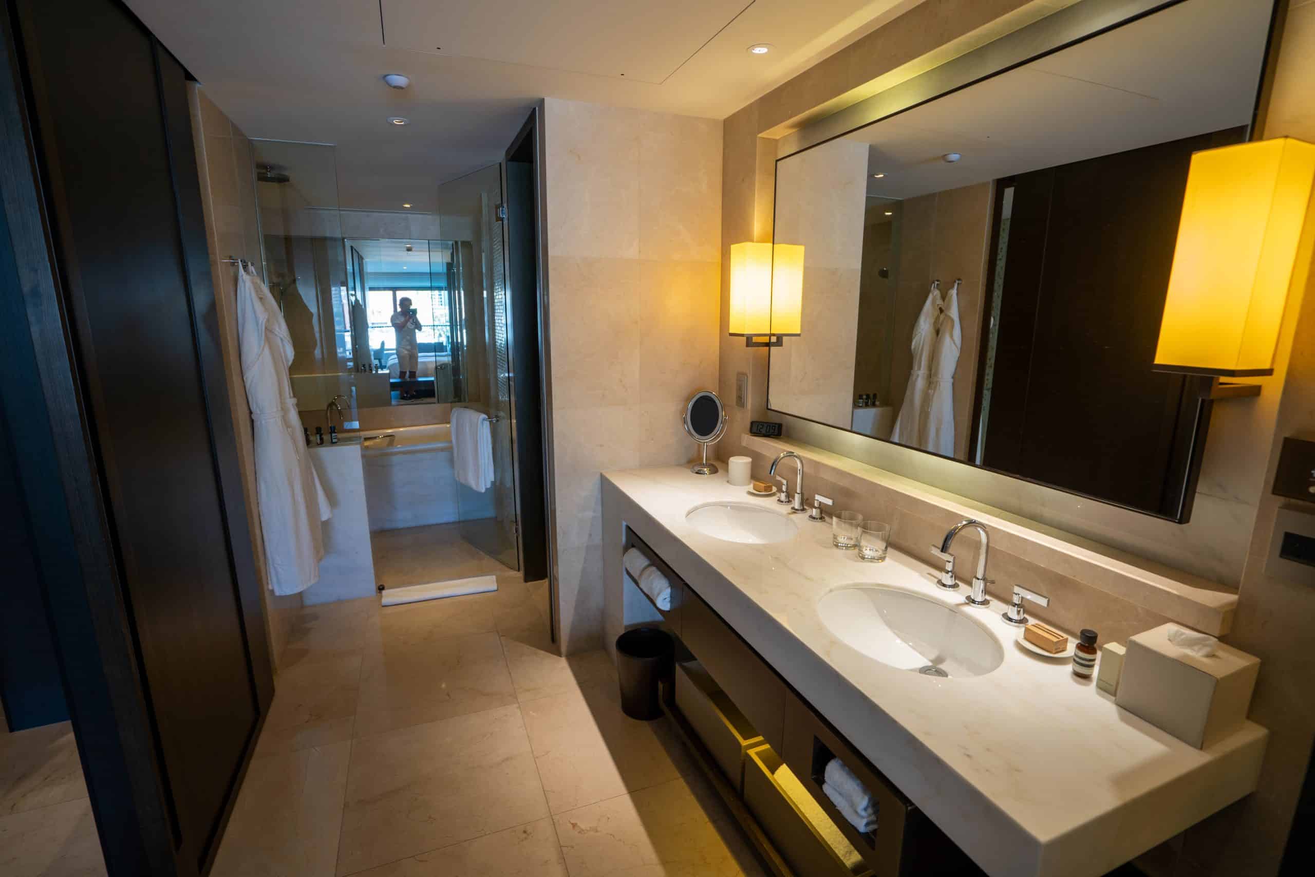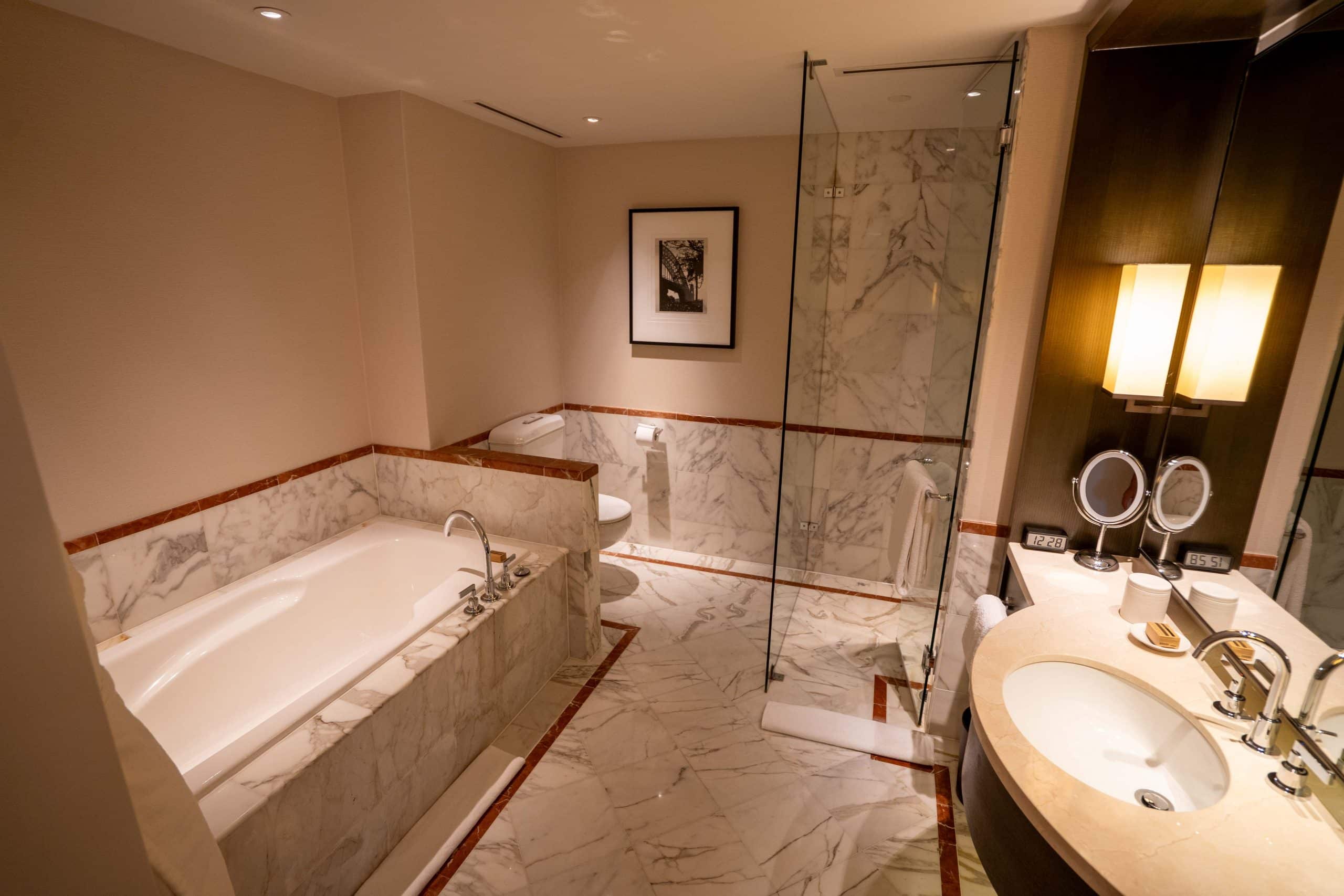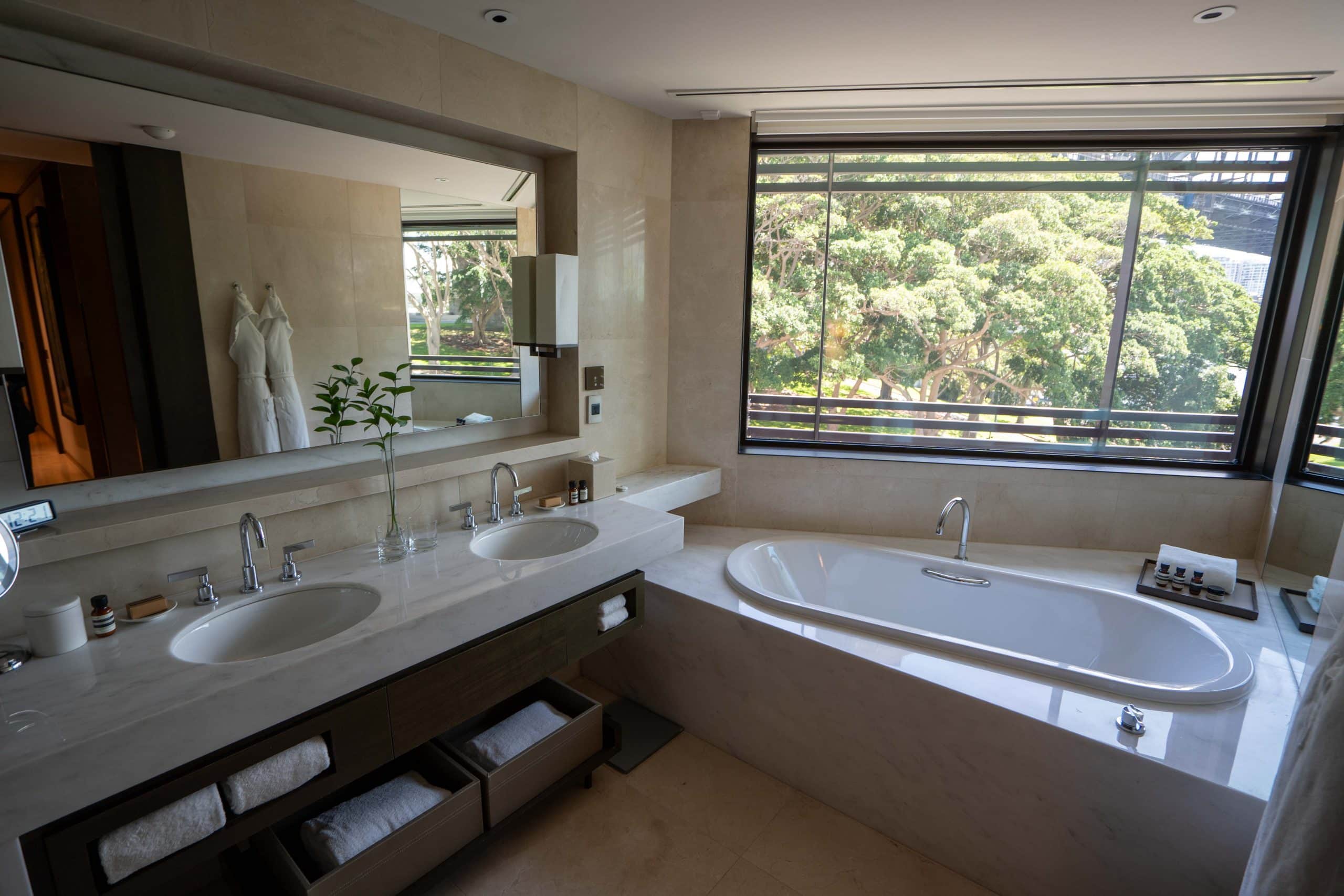 The bathroom is well-equipped with dual vanities, a walk-in shower, and a separate off-centre bathtub. The bathroom features a window that opens up to the bedroom and affords views of the Opera House while soaking in the bathtub, while the toilet is housed within a separate compartment.