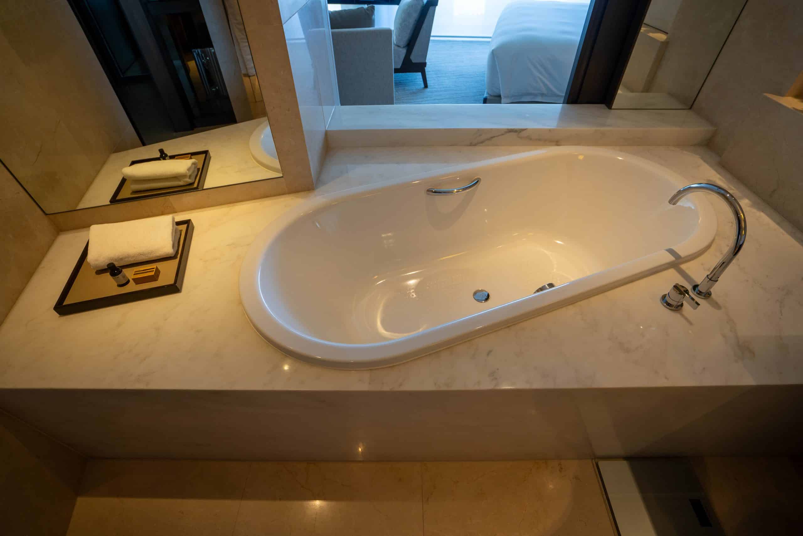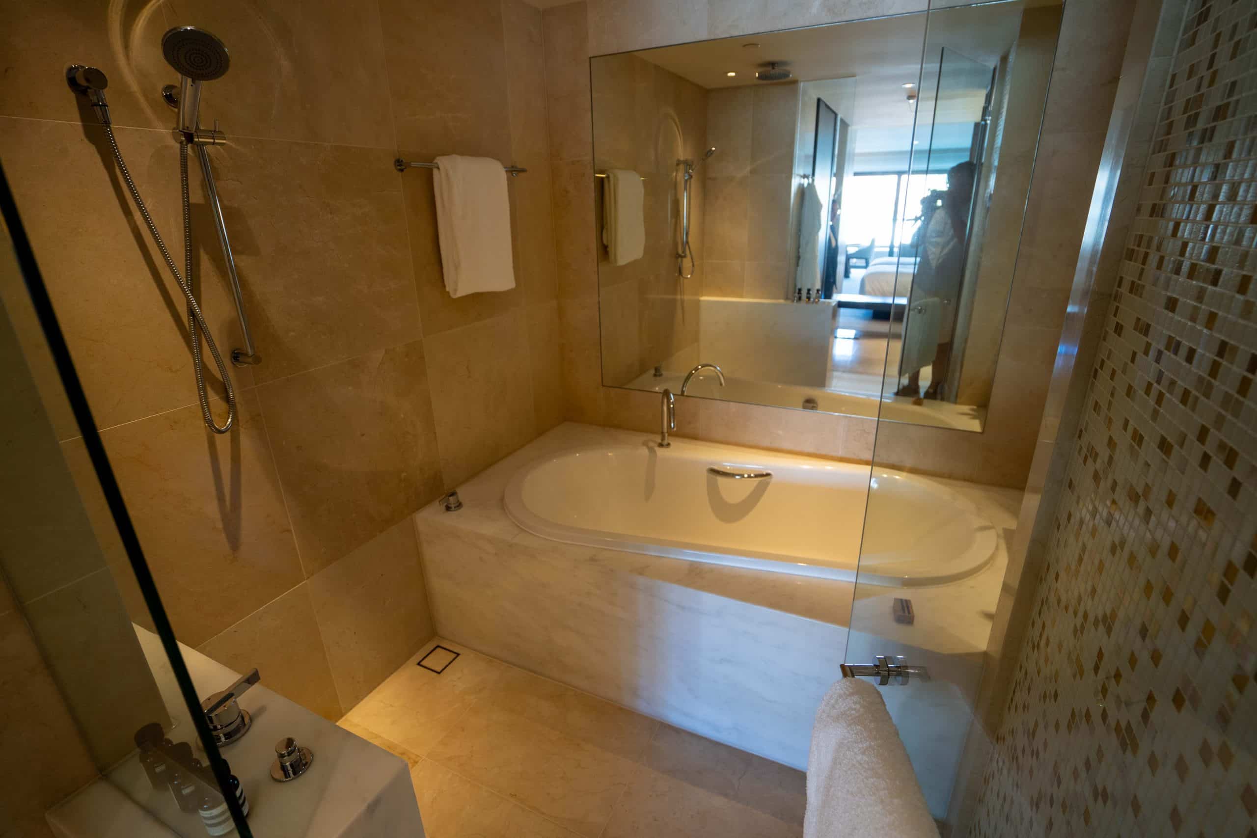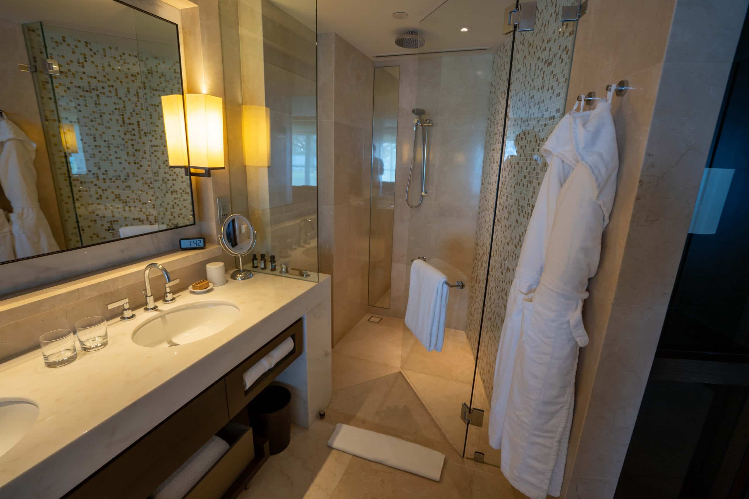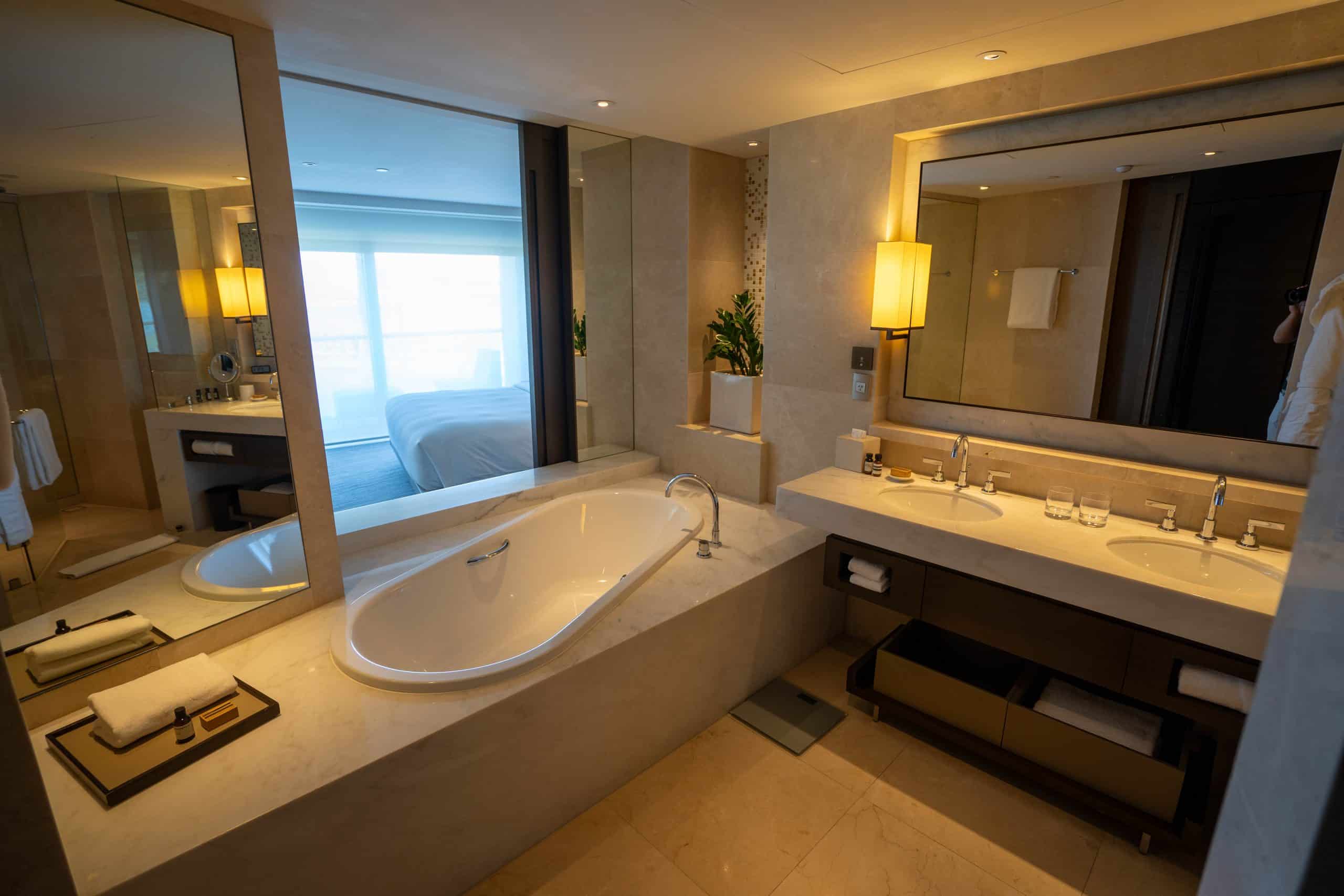 The bathroom is well-equipped with dual vanities, a walk-in shower, and a separate off-centre bathtub. The bathroom features a window that opens up to the bedroom and affords views of the Opera House while soaking in the bathtub, while the toilet is housed within a separate compartment.