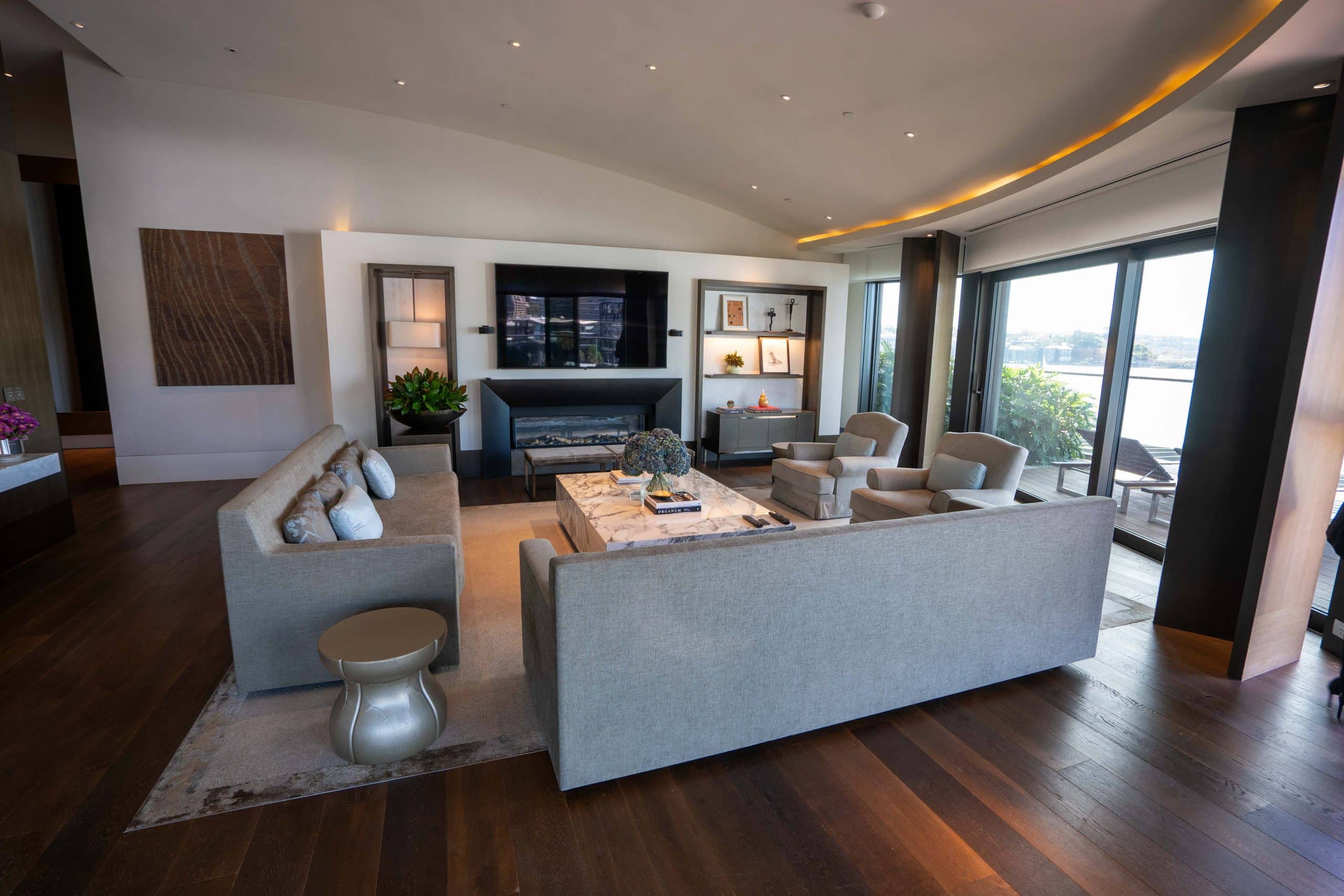 The living room is designed around a central fireplace, adjacent to a wraparound private balcony with nearly 360-degree views of Sydney Harbour.