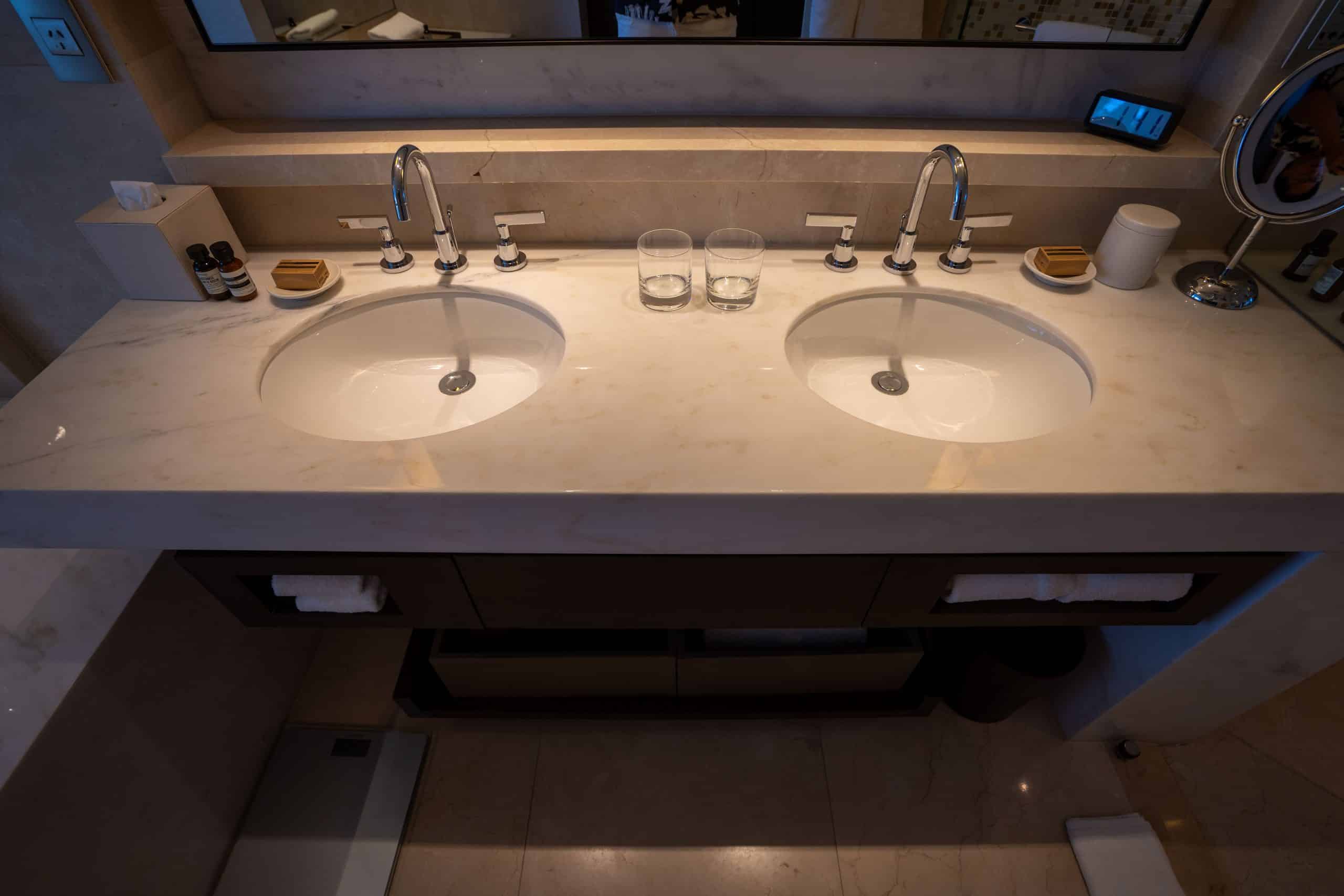 The marble bathroom features dual vanities, a bathtub, and amenities from the skincare brand Le Labo.