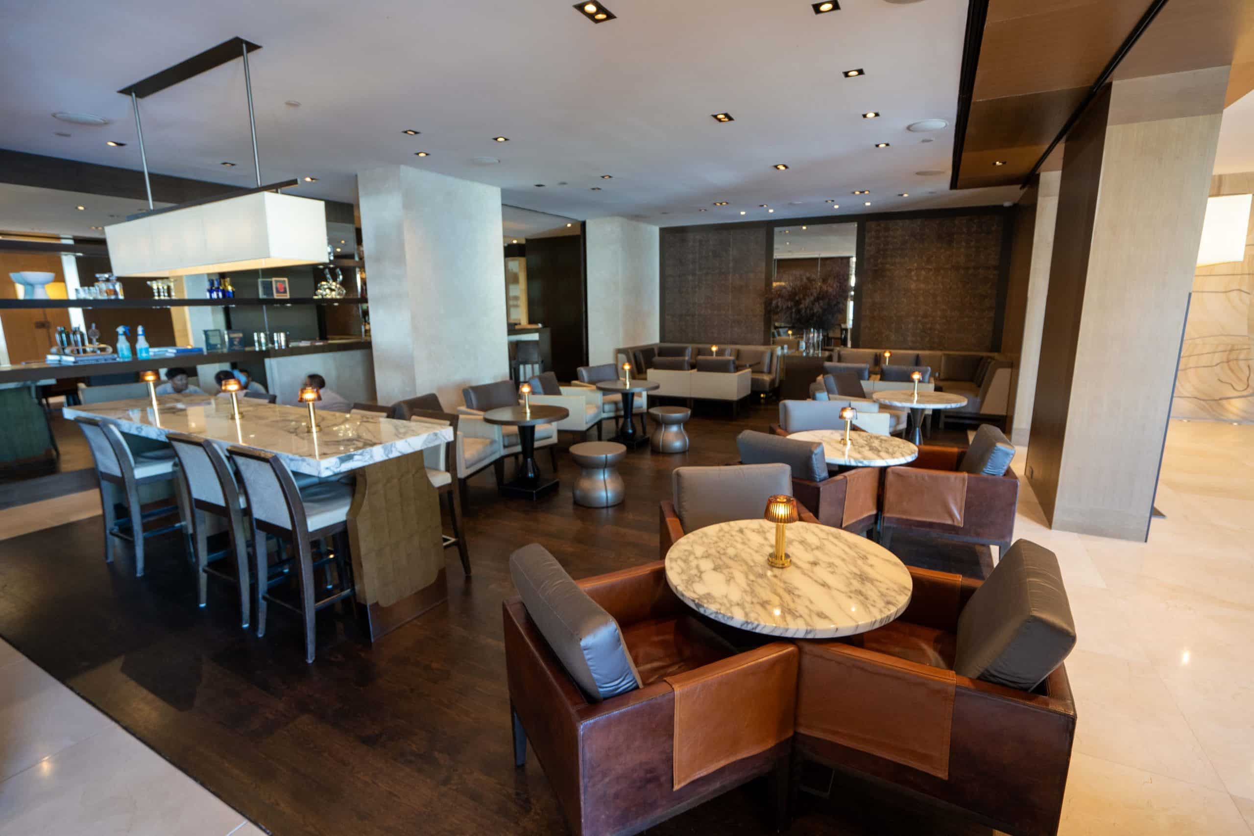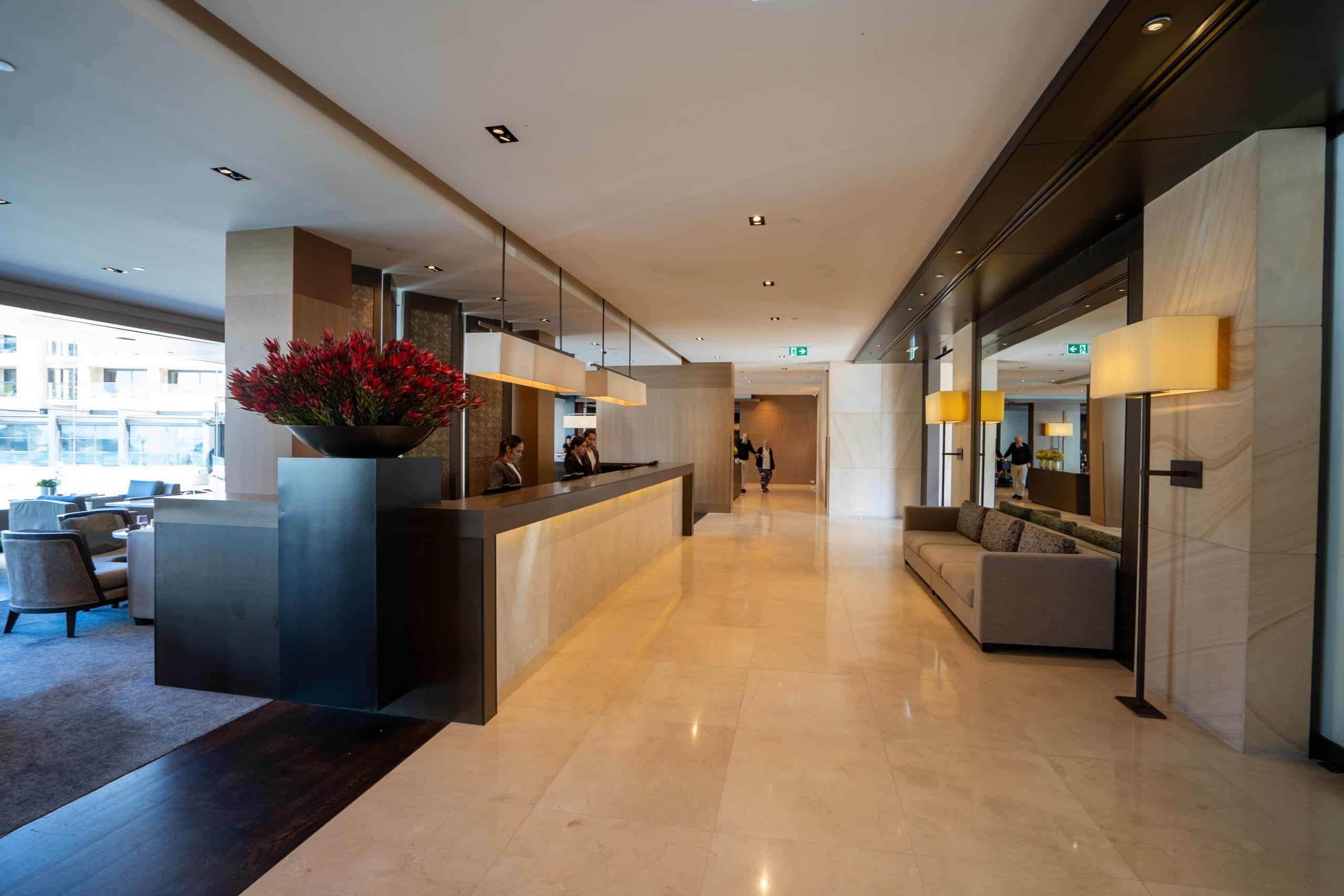 I arrived at the hotel and was greeted by the friendly staff. The lobby has an elegant but understated atmosphere, with check-in desks, a single couch for waiting, and direct access to the restaurant and bar.