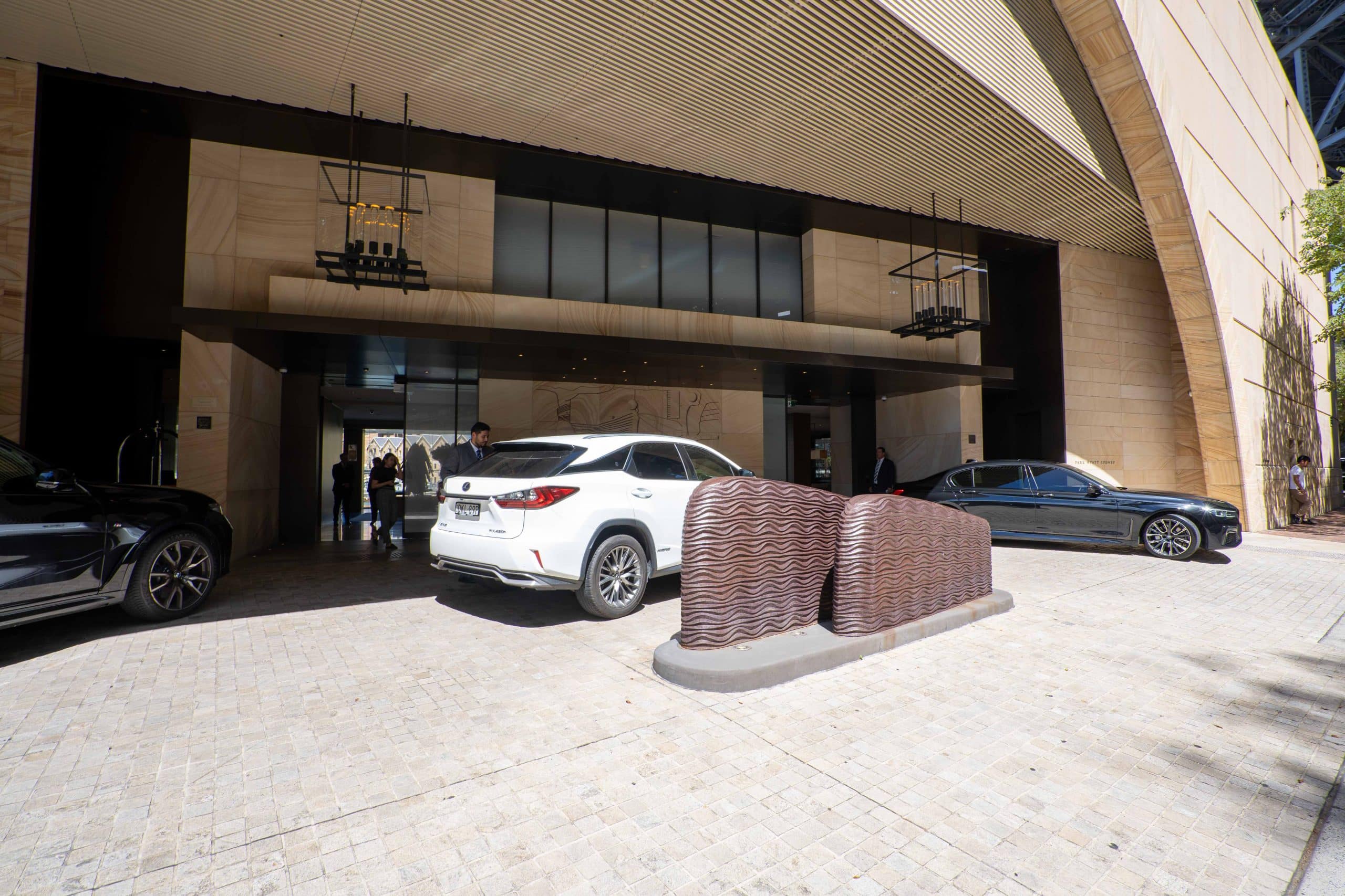 The hotel has two entrances on Hickson Road: a large and dramatic arched opening within the façade acts as the principal entry, and a more discreet back entrance off of the boardwalk along the water.