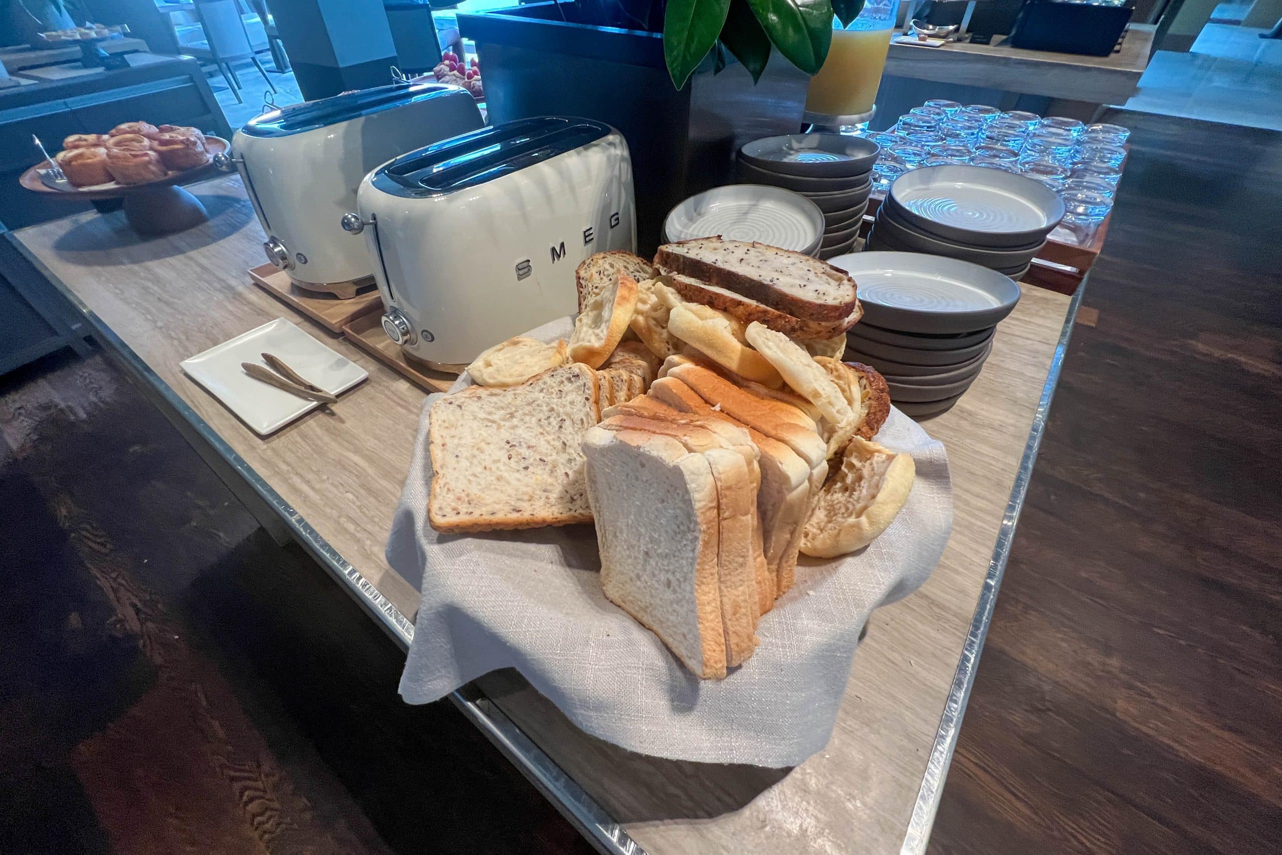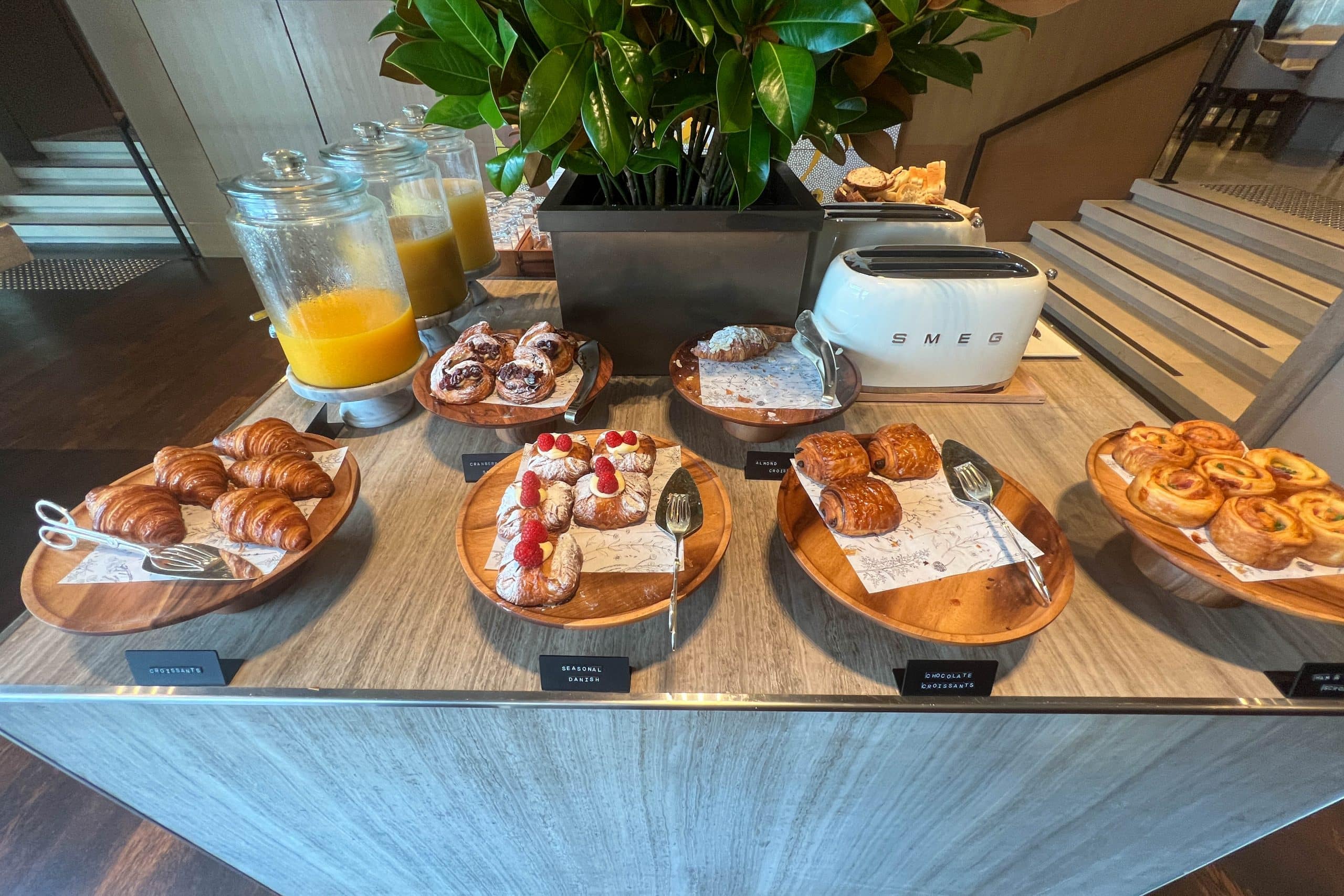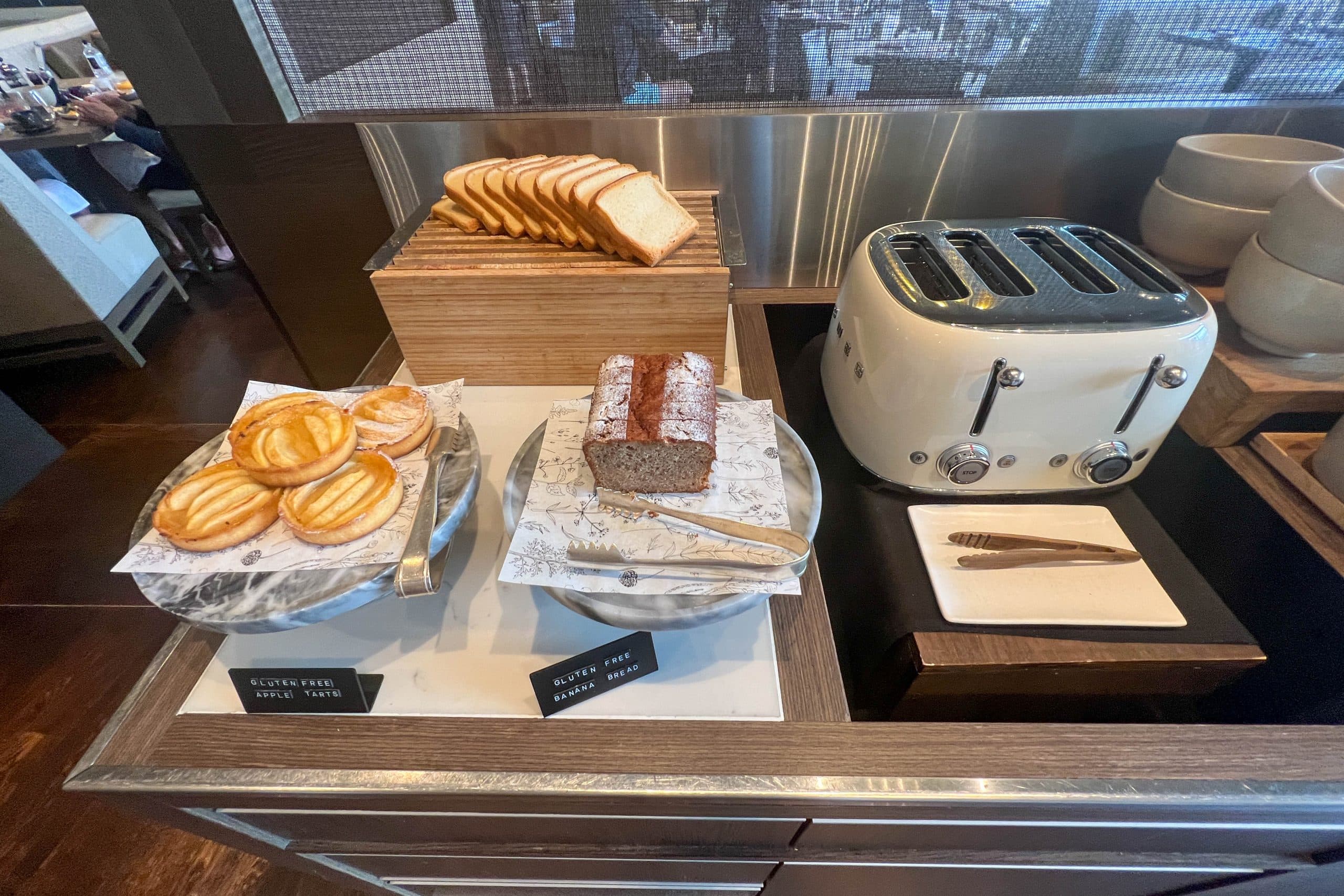 On one counter, there was a variety of pastries, bread, and juice, including gluten-free options for those with dietary restrictions.