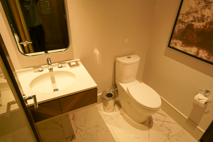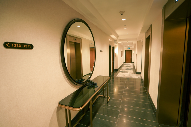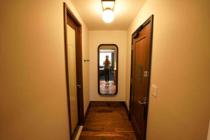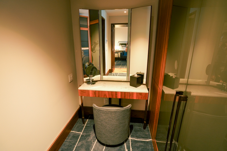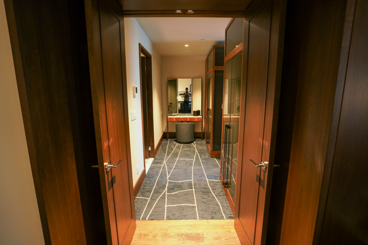 Indeed, that residential feel was exactly what impressed me most about the suite. From the living room, a walk-through hallway branches off with a vanity desk at the far end and two closets encased in frosted glass along the side.