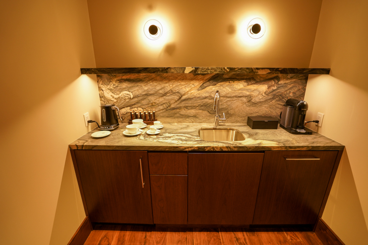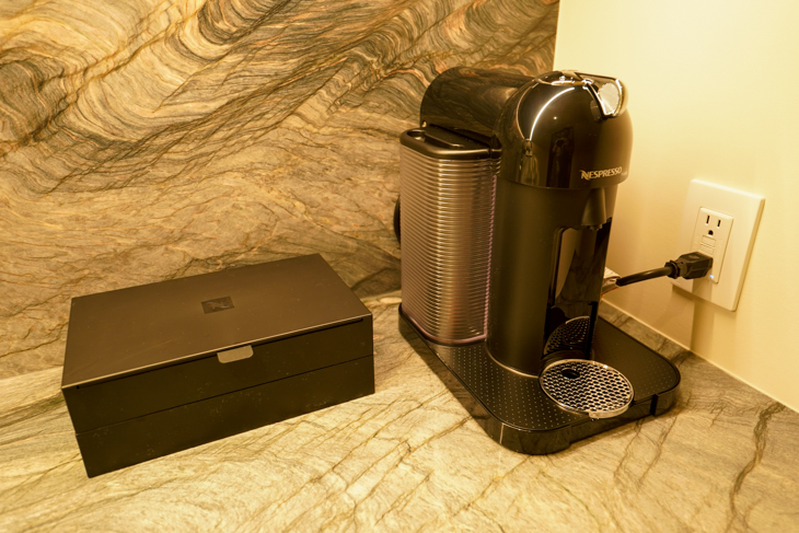 The pantry was full of thoughtful little touches, from the eye-catching marble countertop and backsplash featuring a sink, Nespresso machine, and individual glass capsules of premium teas…
