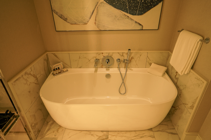 A soaking tub and a set of simple double sinks completed the rest of the bathroom, along with a toilet that wasn’t the automatic Japanese-style kind – a missed opportunity during the recent restorations, if you ask me, considering that many other Toronto luxury hotels do offer this.