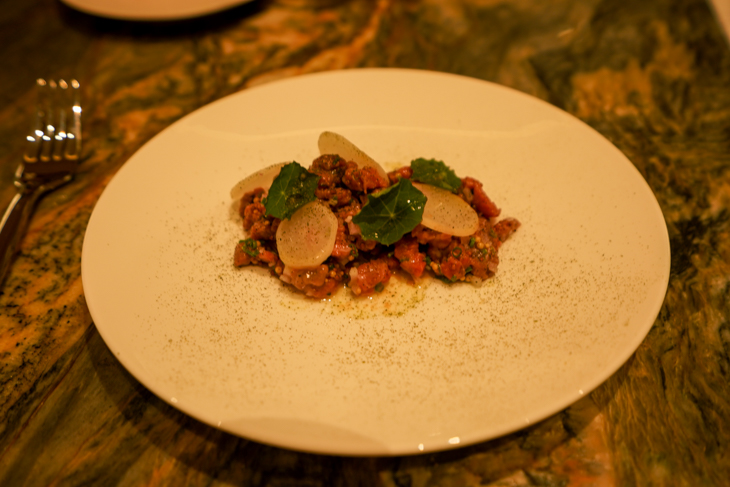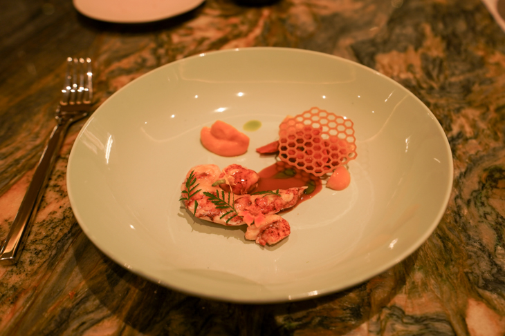 We tried three appetizers among our party: the kanpachi crudo, the beef tartare, and the beeswax poached lobster. The first two items were widely praised; however, I didn’t quite feel that my solitary bite of lobster was interesting enough to justify the price point.