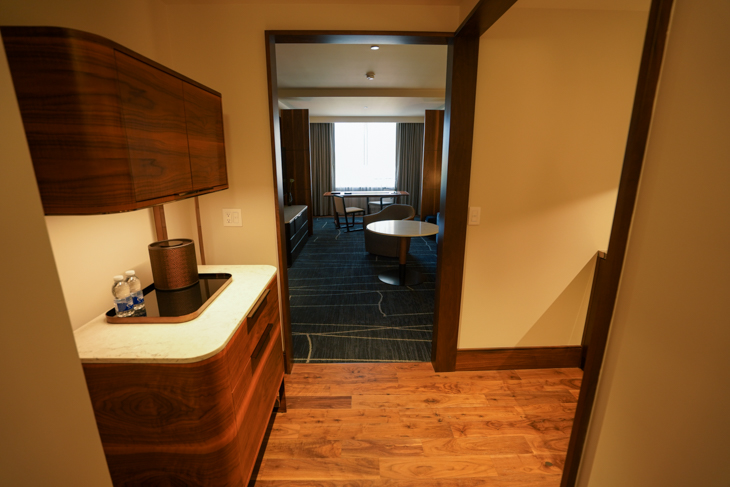 I was assigned Room 1324, around the corner at the end of the hallway on the 13th floor. The One-Bedroom Deluxe Corner Suite begins with a small foyer featuring the powder room and pantry, giving way to the living room.