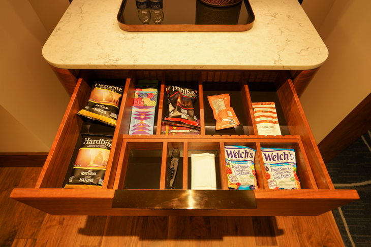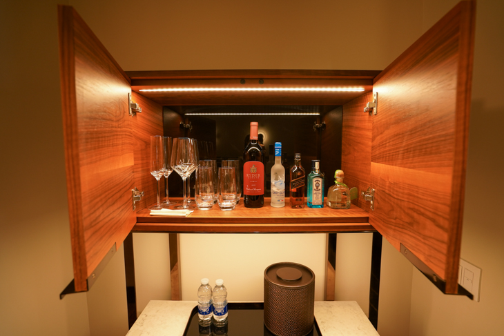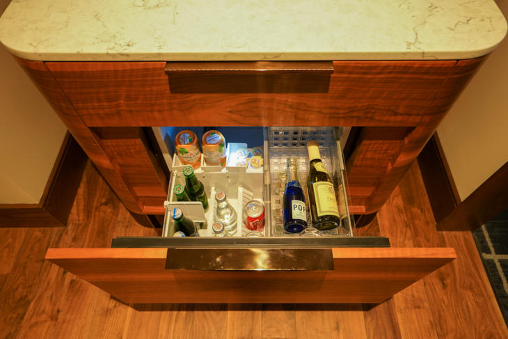 …to the free-standing cabinet with the minibar selection and pull-out fridge drawer.