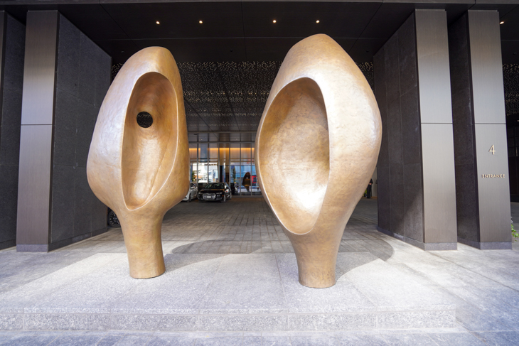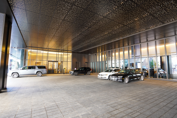 The property’s exterior is carries a look of understated luxury, marked by a new public art installation entitled “Rendezvous” by Canadian artist An Te Liu, as well as a gorgeous starry-night design illuminating the driveway.