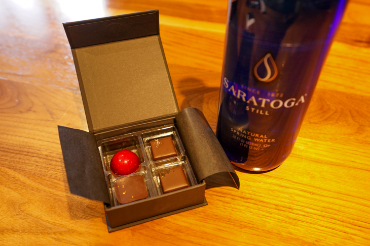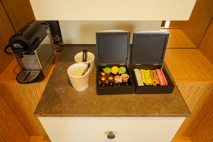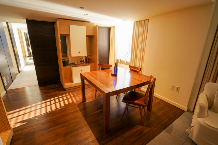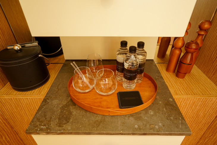 The pantry and minibar are also dotted around the dining space. A welcome amenity of chocolate truffles and still water was left for me on the dining table.