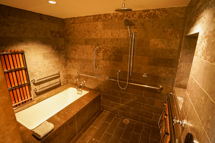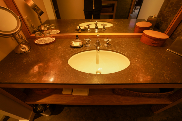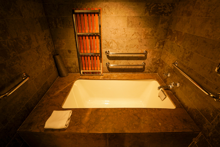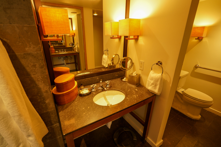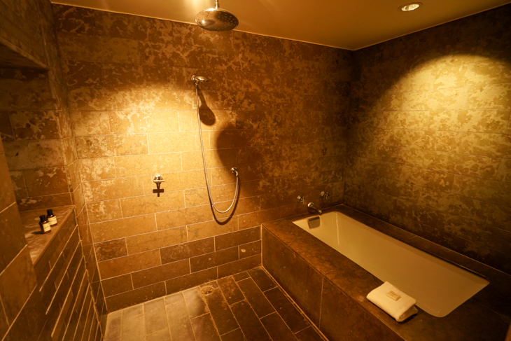 A narrow walkway connects the Park Junior Suite’s living room, bedroom, and bathroom. The bathroom turned out to be very similar to the Park Executive Suite, with the same dark marble finishes on the shower and bathtub.