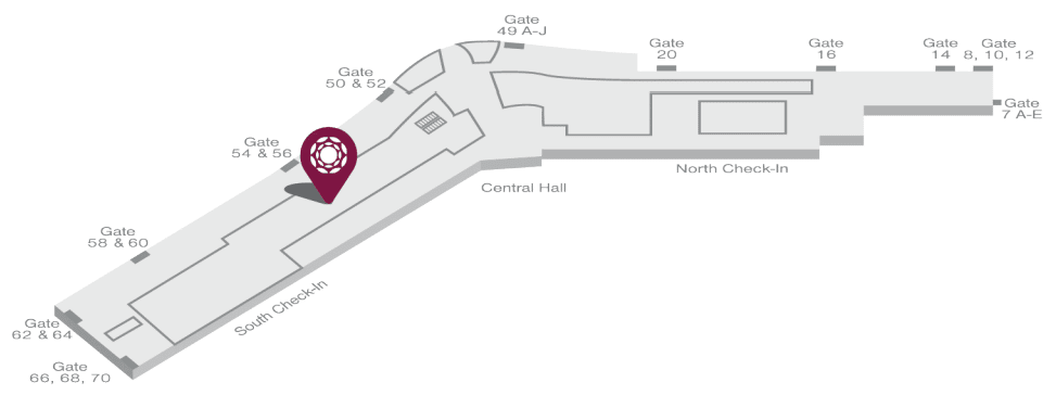 The Plaza Premium sits right across the hall from its friendly rival, the Maple Leaf Lounge. Both are located between Gates 54 and 56, which are the main ports for passengers embarking on flights to Toronto or Vancouver.