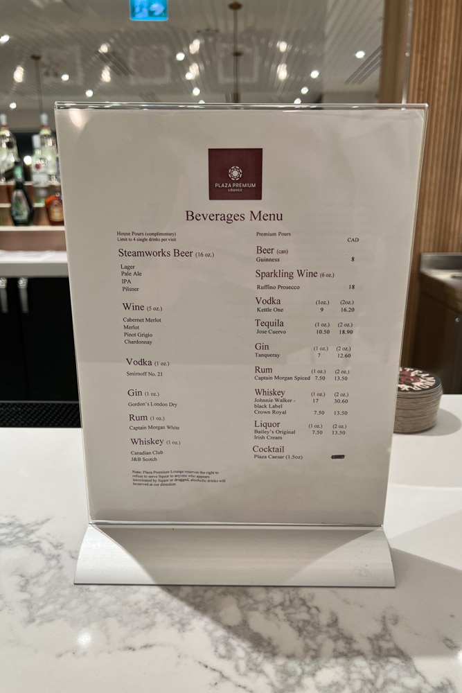 The lounge has a selection of premium options as well, including Baileys, Caesars, Johnnie Walker whisky, and sparkling wine, to name a few. Keep in mind that you’ll have to pay for some of these options.
