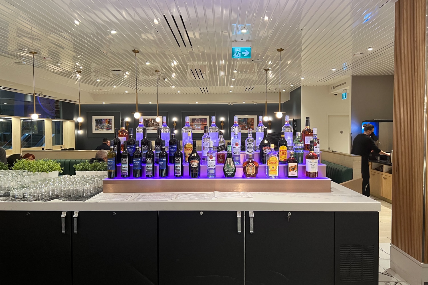 The bar is certainly a highlight of this Plaza Premium Lounge. It creates a natural focal point with its sleek marble countertops and a purple glow highlighting a selection of spirits and whiskys.