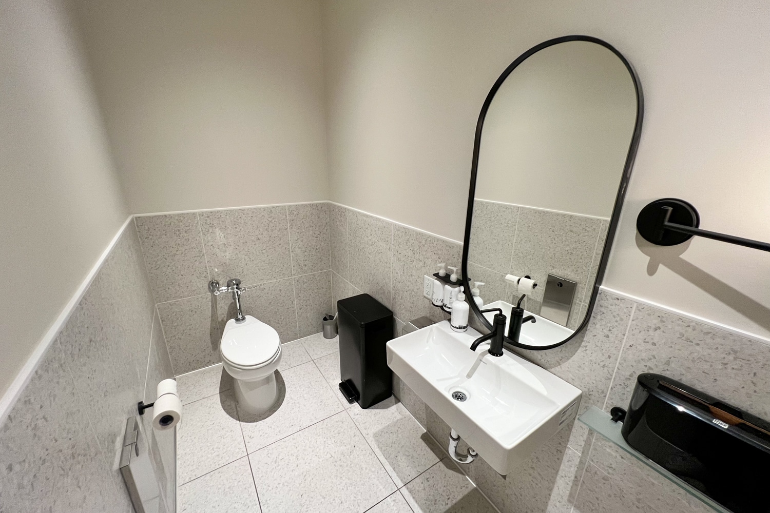 The lounge featured modern and stylish restroom facilities, with stone floors and jet black finishes. The room was compact with a single vanity and toilet; however, it was spotless and well-maintained.