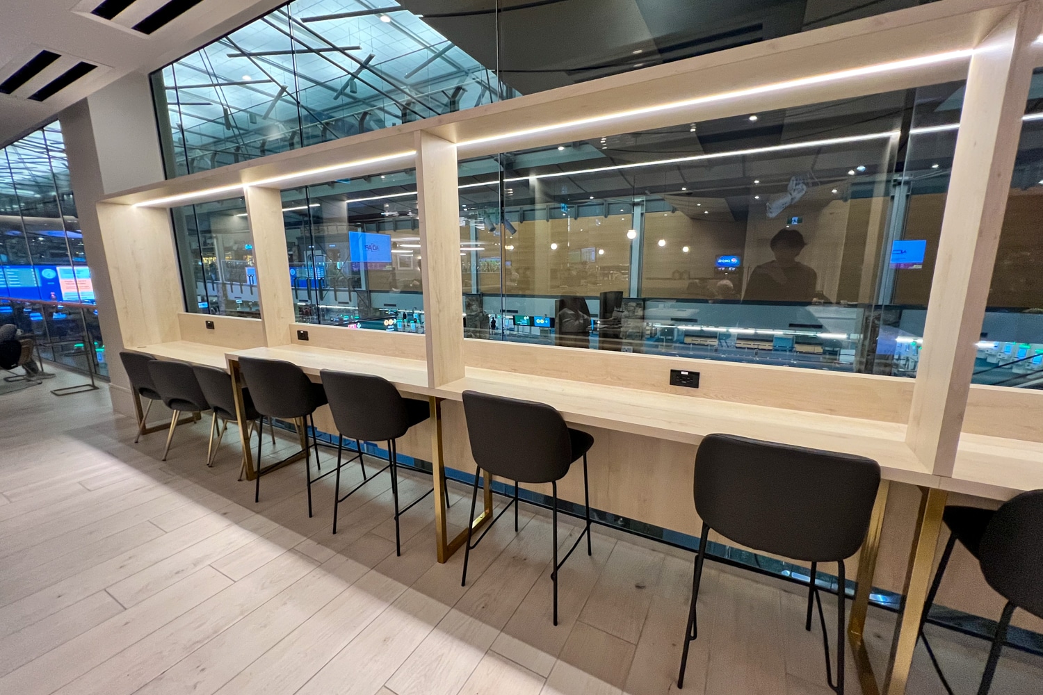 At the rear of the lounge, individual work-station seats looks out onto the arrivals hall through glass windows. There are seats placed along countertops, as well as comfortable leather armchairs.