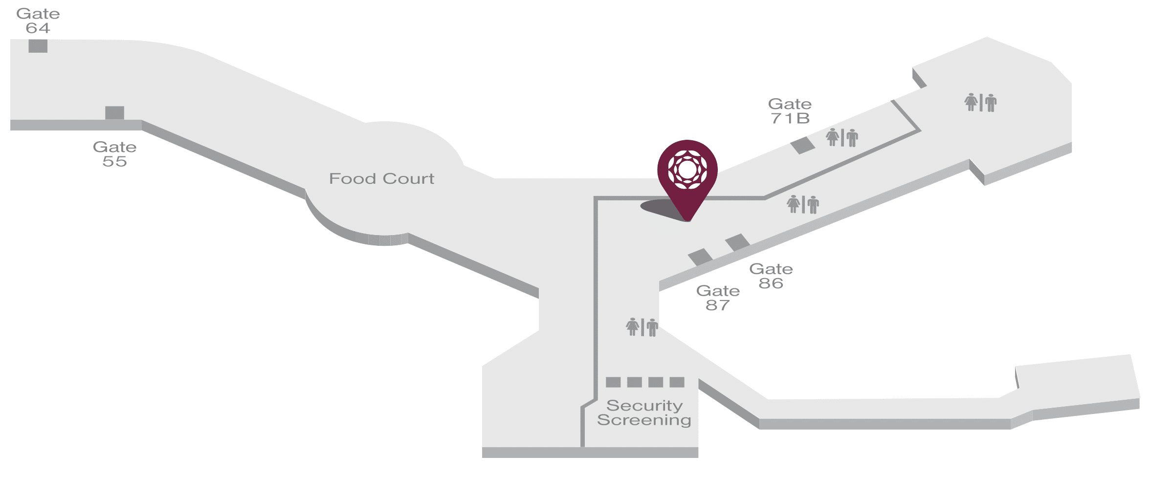 The lounge is located airside midway through the terminal across from Gate E88, overlooking the arrivals hall below.